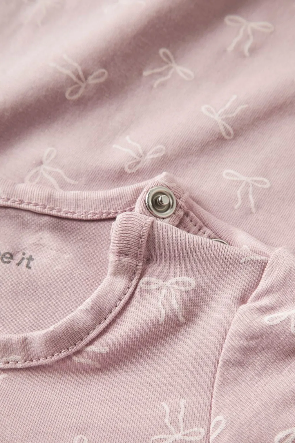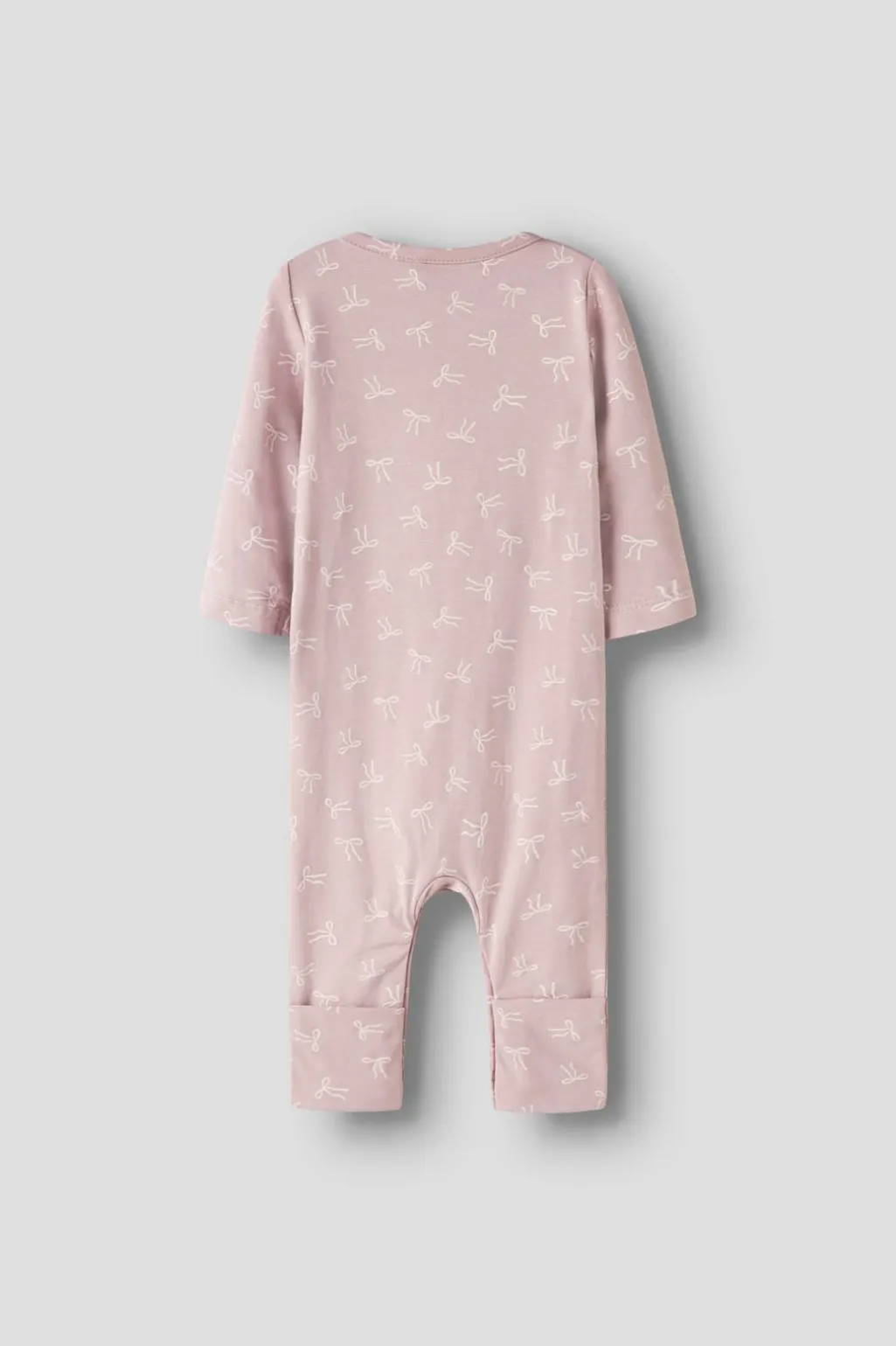 Lyserød natdragt fra Name It med små hvide sløjfer som print. Den ankellange dragt har rund hals, lange ærmer og praktiske trykknapper langs benene.