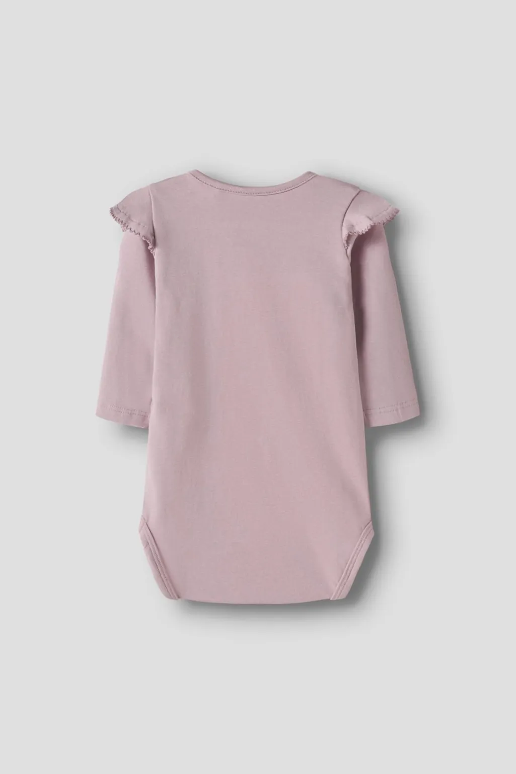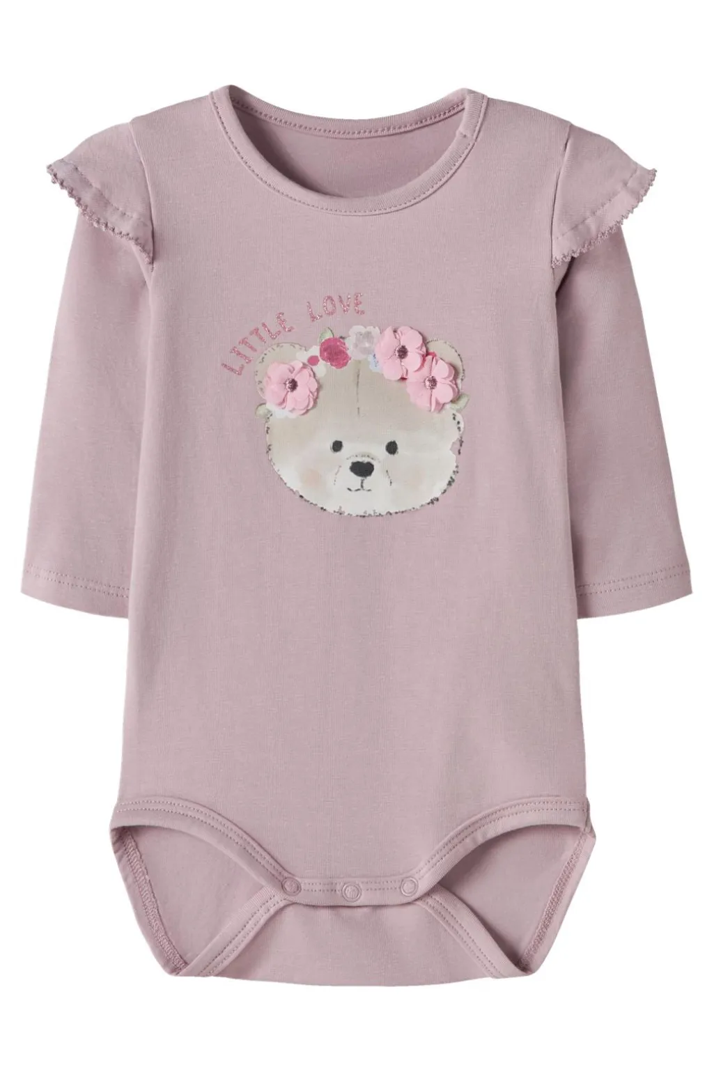 Lyslilla body fra Name It med lange ærmer og rund hals. Den er fremstillet i en blød bomuldsjersey med flæsedetaljer på skuldrene og et bjørnemotiv med blomster på forsiden.