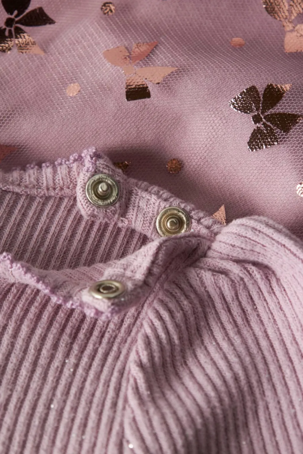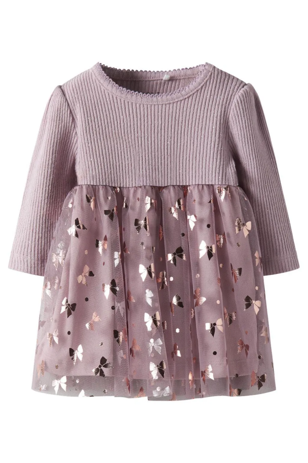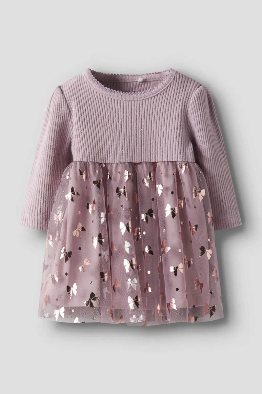 Lys lilla kjole fra Name It med ribstrik og tyl-detaljer. Kjolen har et stribet mønster på overdelen og metalliske sløjfeprint på tylskørtet.