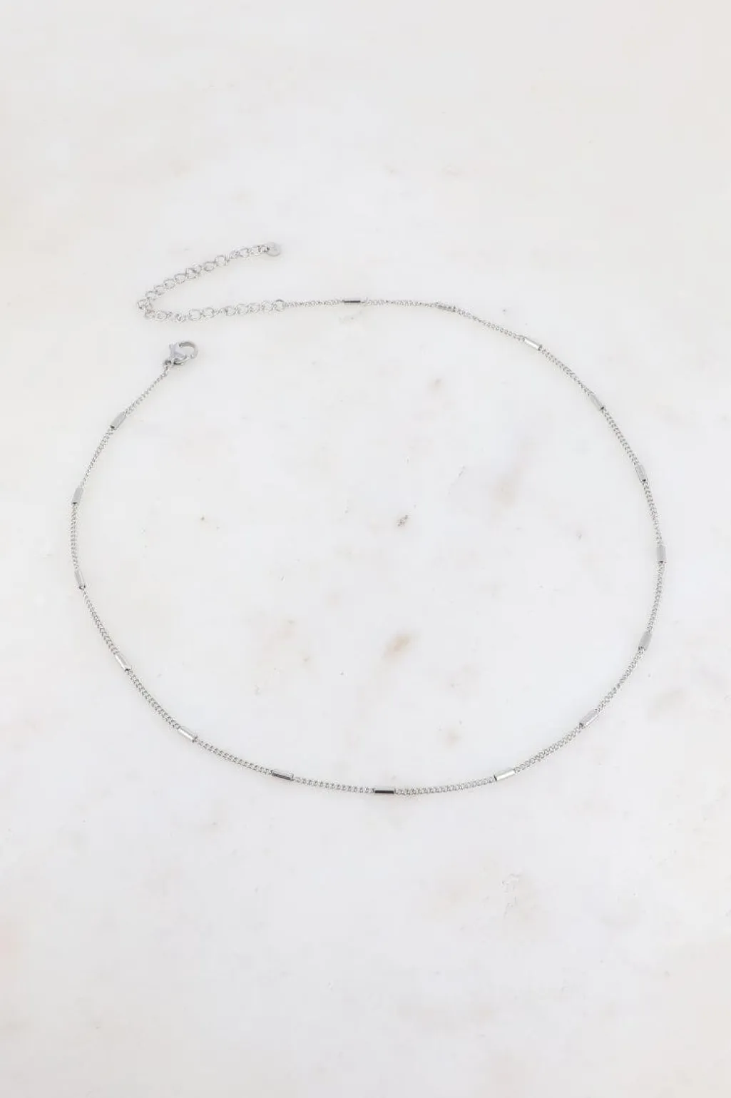 Sølvfarvet halskæde fra Mellow Moon med aflange perler langs kæden. Halskæden har en fin kæde med små perler, der er jævnt fordelt i designet.