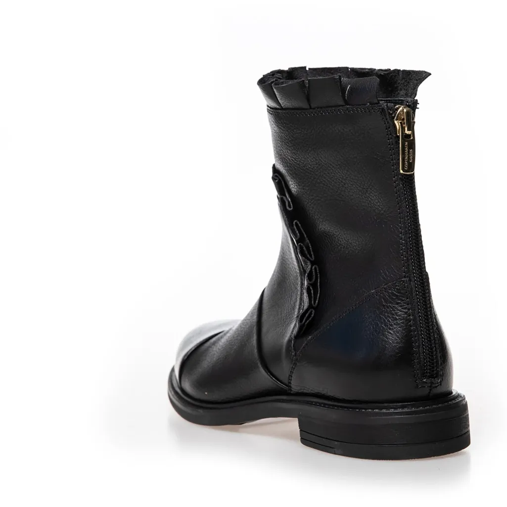 Sort ankelstøvle fra Copenhagen Shoes, lavet af læder. Støvlen har en glat overflade med dekorative detaljer langs skaftet og en lynlås bagpå.
