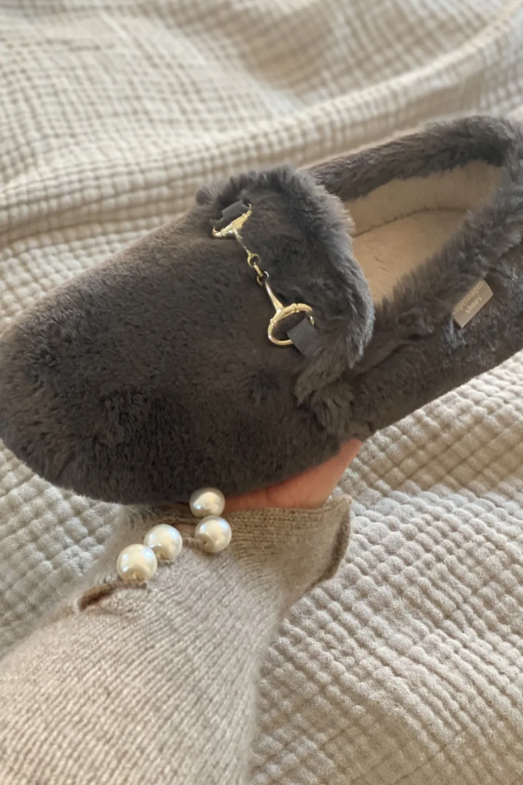 Mørkegrå hjemmesko i blødt tekstil fra Copenhagen Shoes. Den dekorative guldkæde på oversiden giver hjemmeskoen et pænt look, mens den bløde inderside sikrer komfort.