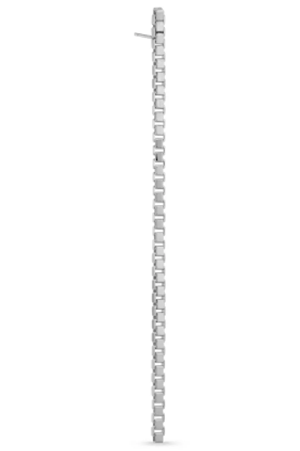 Sølvørering fra Jane Kønig med lang kæde. Den blanke overflade reflekterer lyset, mens kæden bevæger sig frit og skaber dynamik.