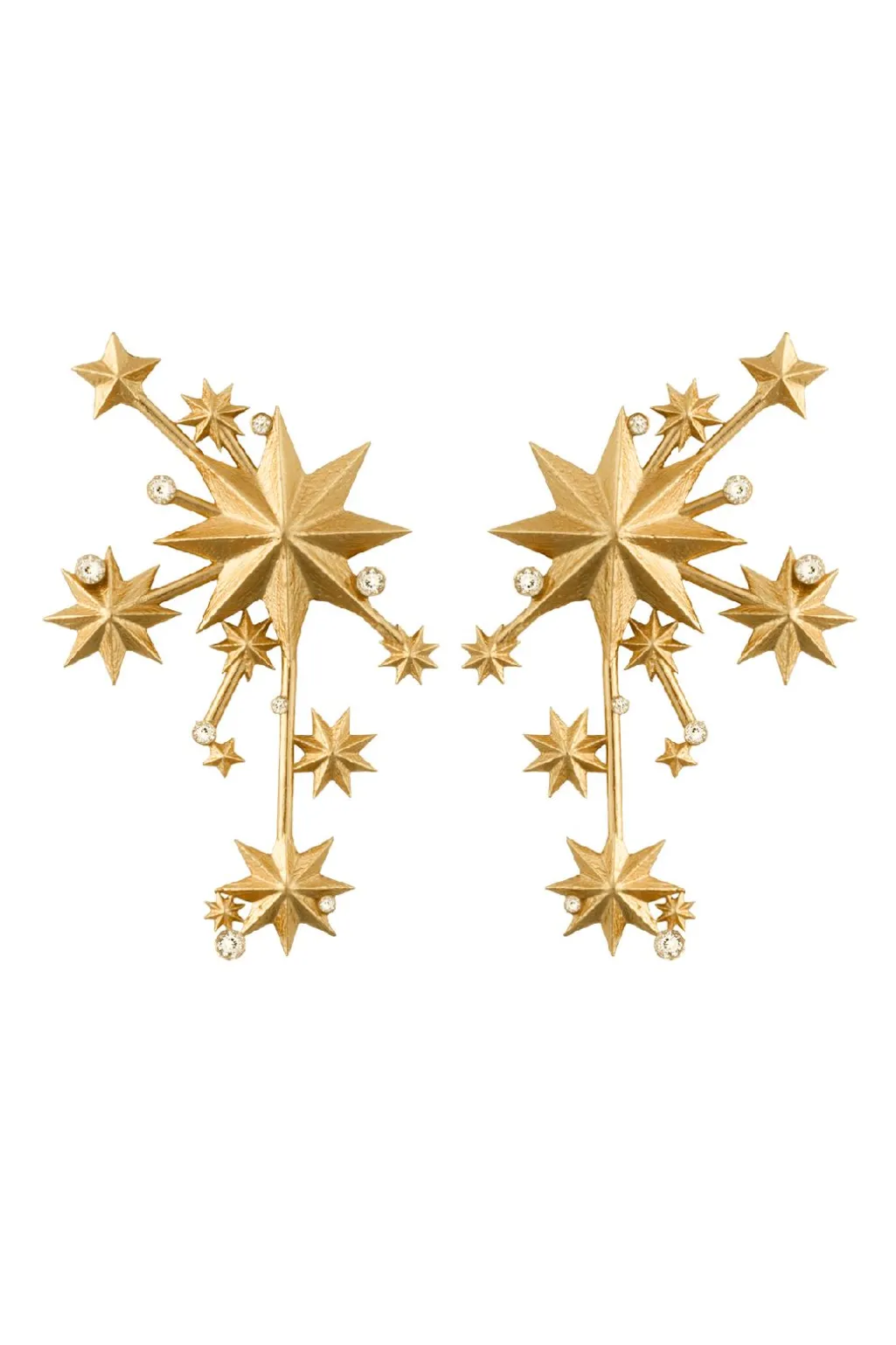 Forgyldte øreringe fra House of Vincent med stjernemønster. Øreringene har et design med stjerner i forskellige størrelser og små krystaller mellem stjernerne.