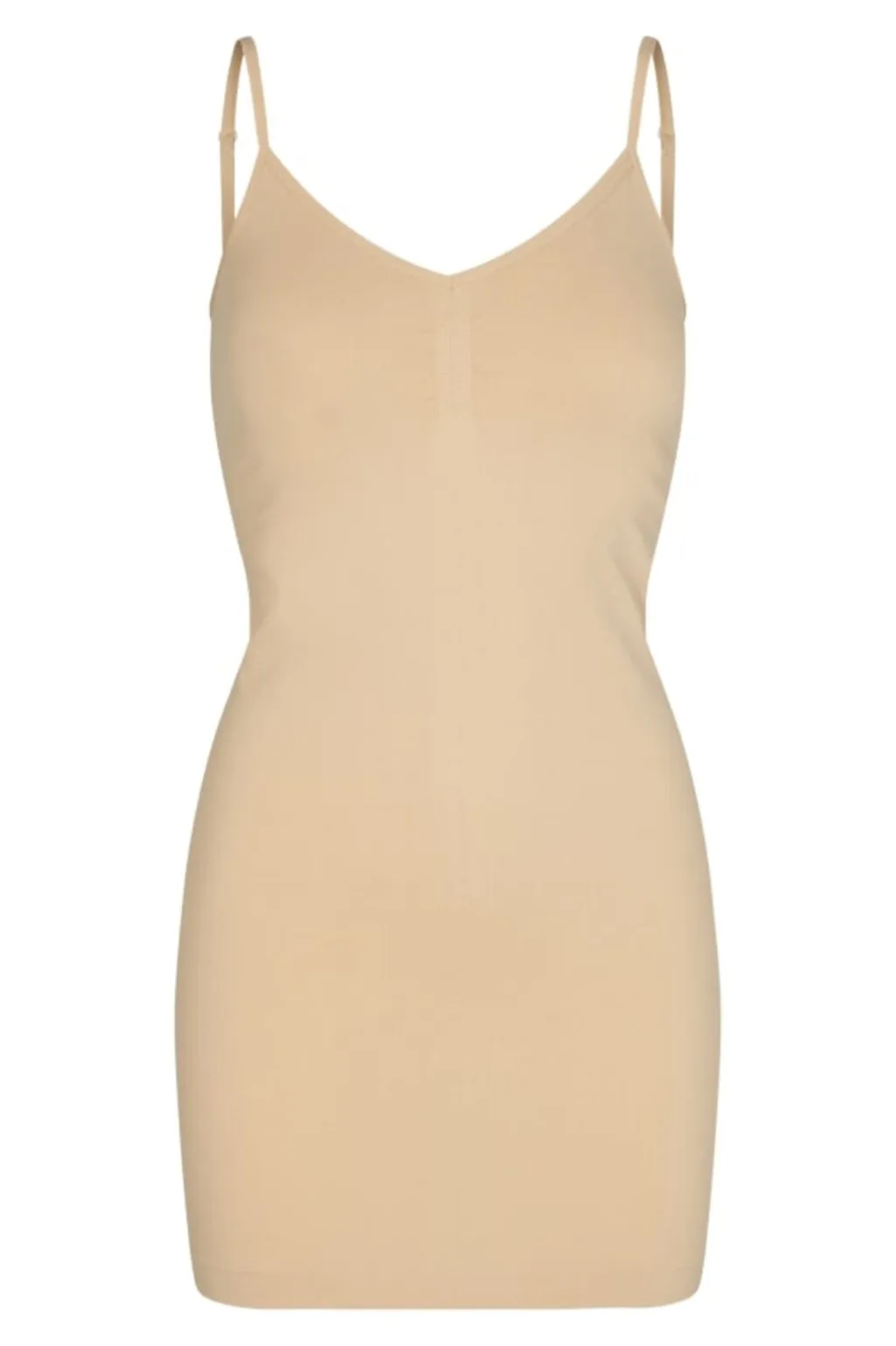 Slipkjole fra Liberte i en nude farve. Den er fremstillet af et strækbart materiale med V-halsudskæring og tynde stropper, der kan justeres efter behov.