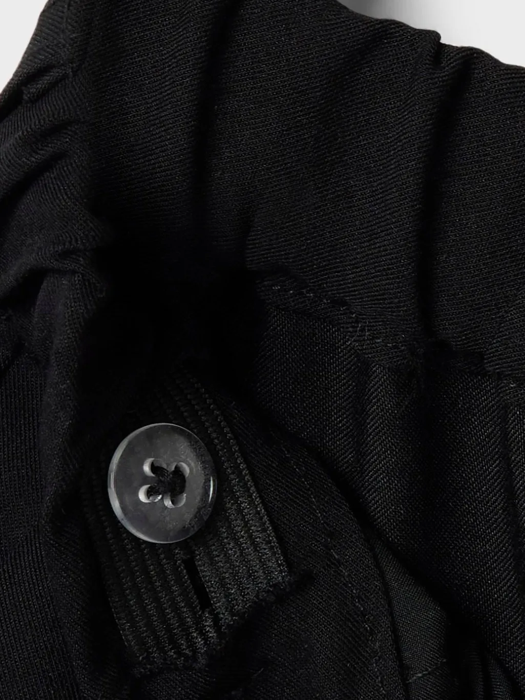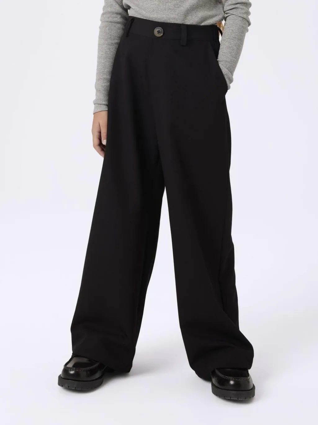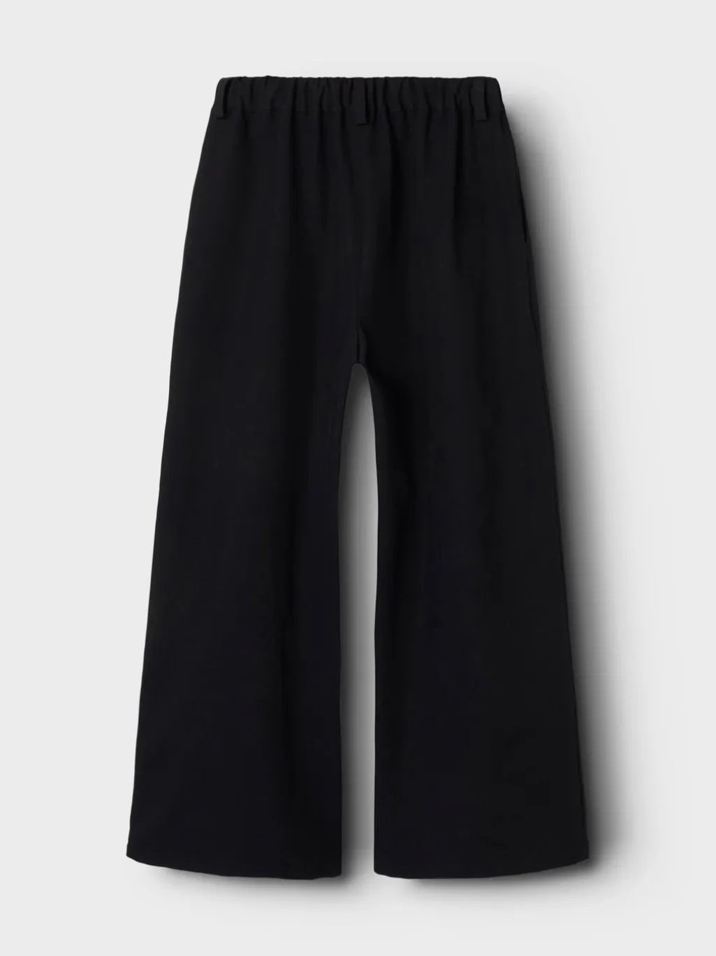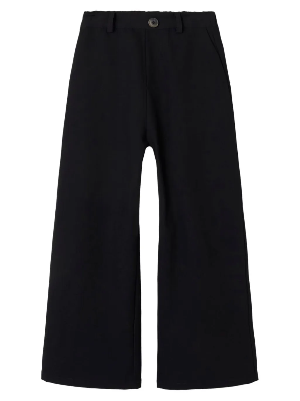 Sorte bukser med brede ben fra Name It. Bukserne har ankellængde og kombinerer elastisk talje med knaplukning.