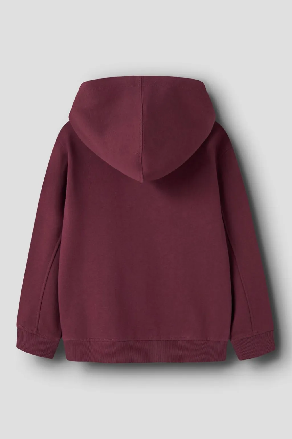Bordeaux sweatshirt fra Name It med hætte og fotoprint på forsiden. Den børstede kvalitet med blød inderside giver en behagelig fornemmelse mod huden, mens det grafiske print med bamse og tekst tilføjer et legende udtryk.