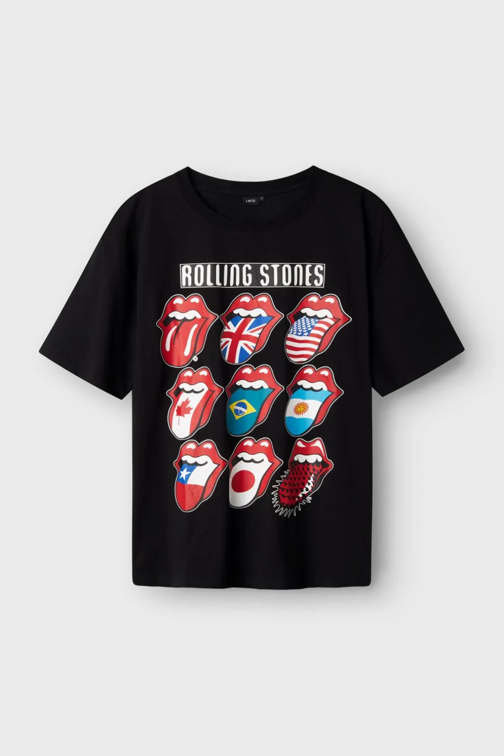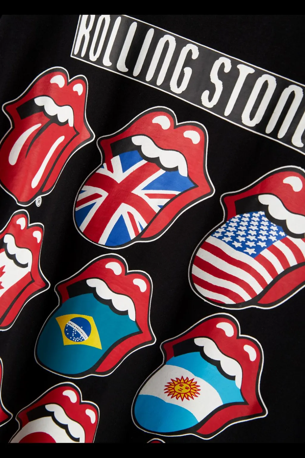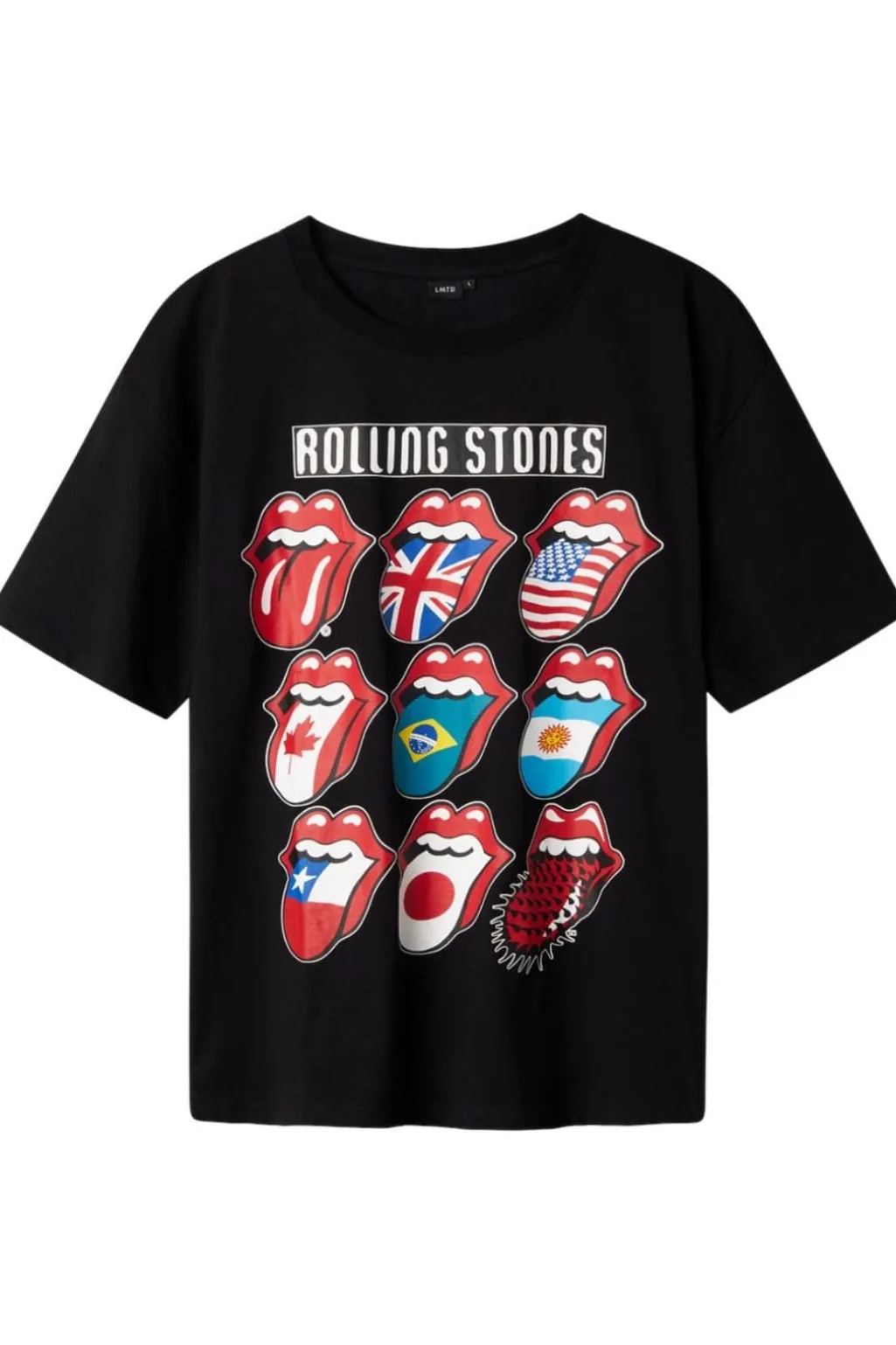 Sort t-shirt fra Lmtd i jersey-kvalitet. T-shirten har et grafisk design med Rolling Stones-logo og internationale flag i gummiprint. Den runde hals og de korte ærmer giver en klassisk t-shirt-silhuet.