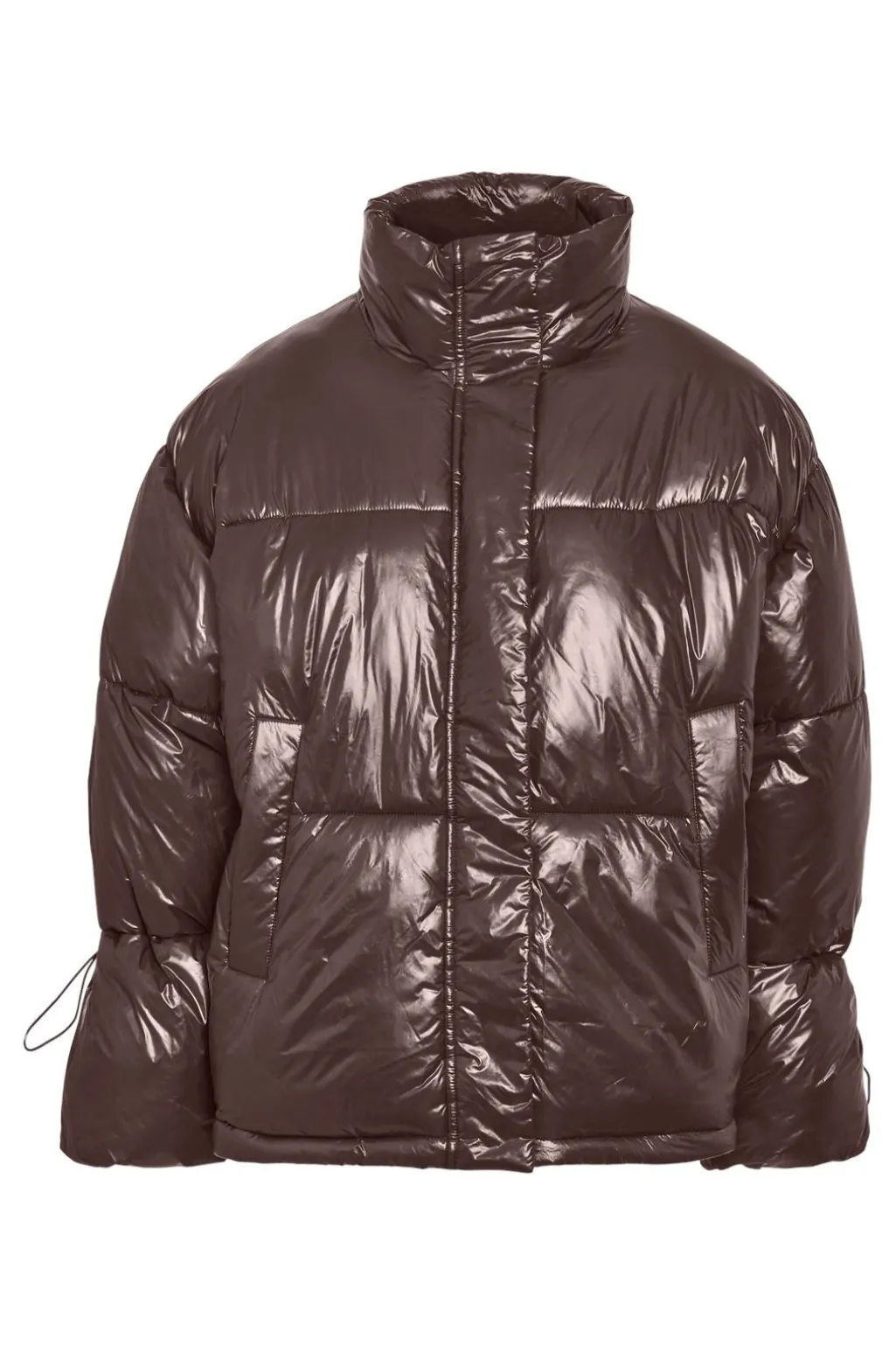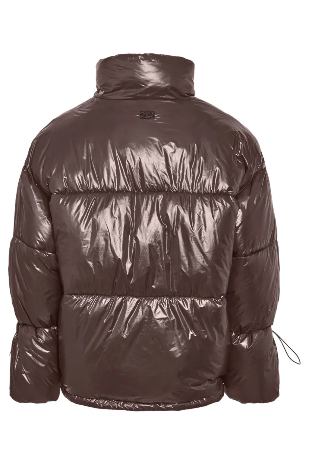 Pufferjakke fra Noisy May i en mørk rødbrun nuance. Jakken er lavet af 100 % nylon med en skinnende overflade og store polstrede sektioner.