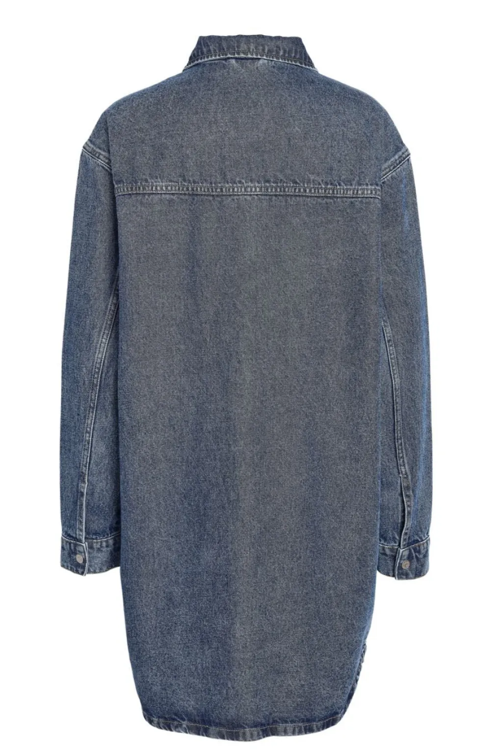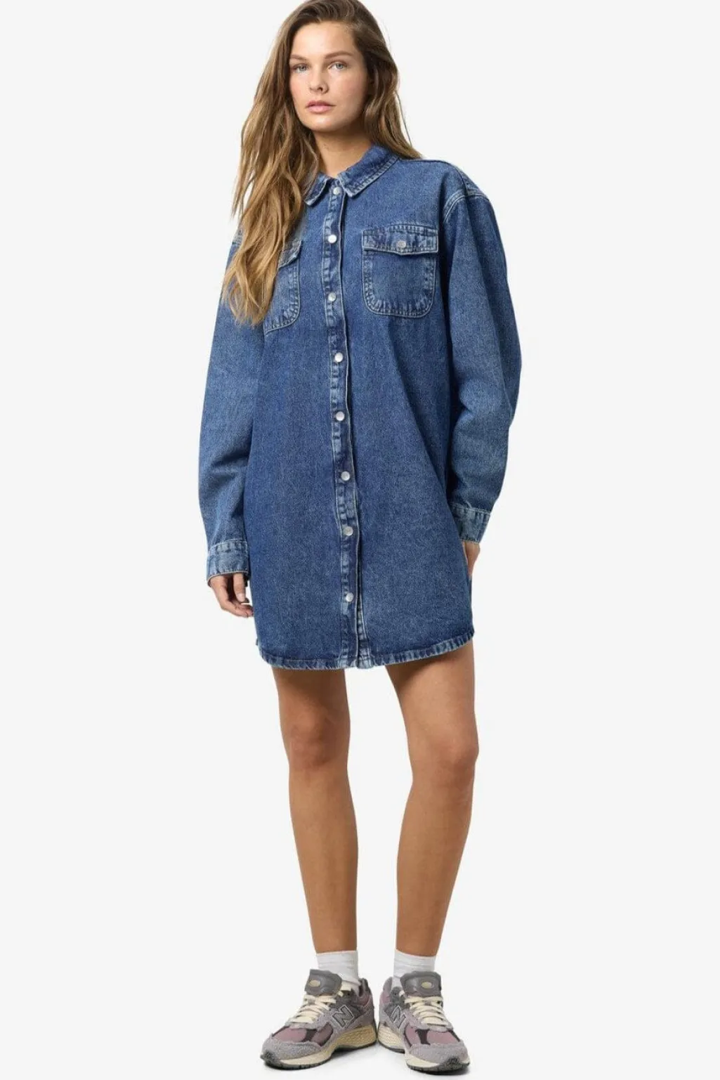 Denimkjole fra Noisy May i mediumblå denim. Kjolen har en oversize pasform med lange ærmer og klassisk skjortekrave.