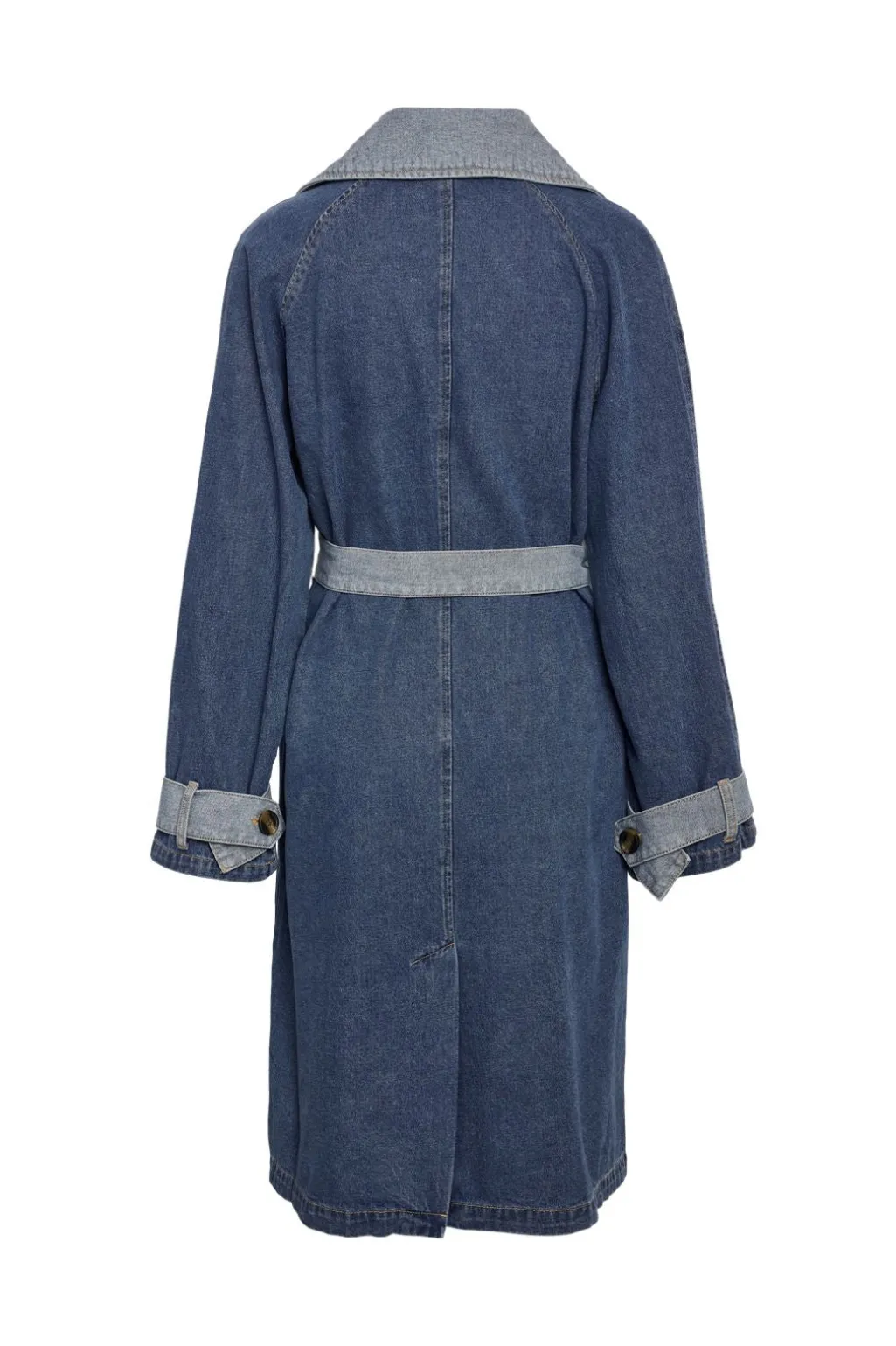 Mørkeblå denimtrenchcoat fra Noisy May med kontrastpaneler i forskellige nuancer af denim. Trenchcoaten har en revers halsudskæring og dobbeltradet knaplukning.