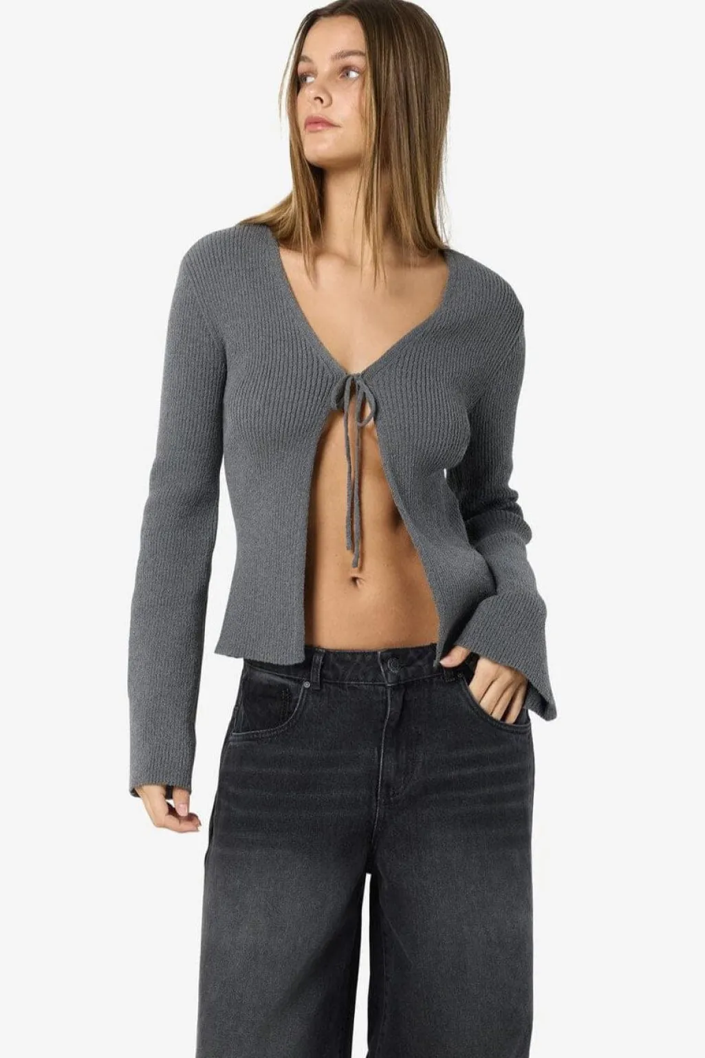 Strikket cardigan fra Noisy May i kulgrå. Cardiganen har bindebånd foran og en ribbet tekstur, der giver den et struktureret udtryk.