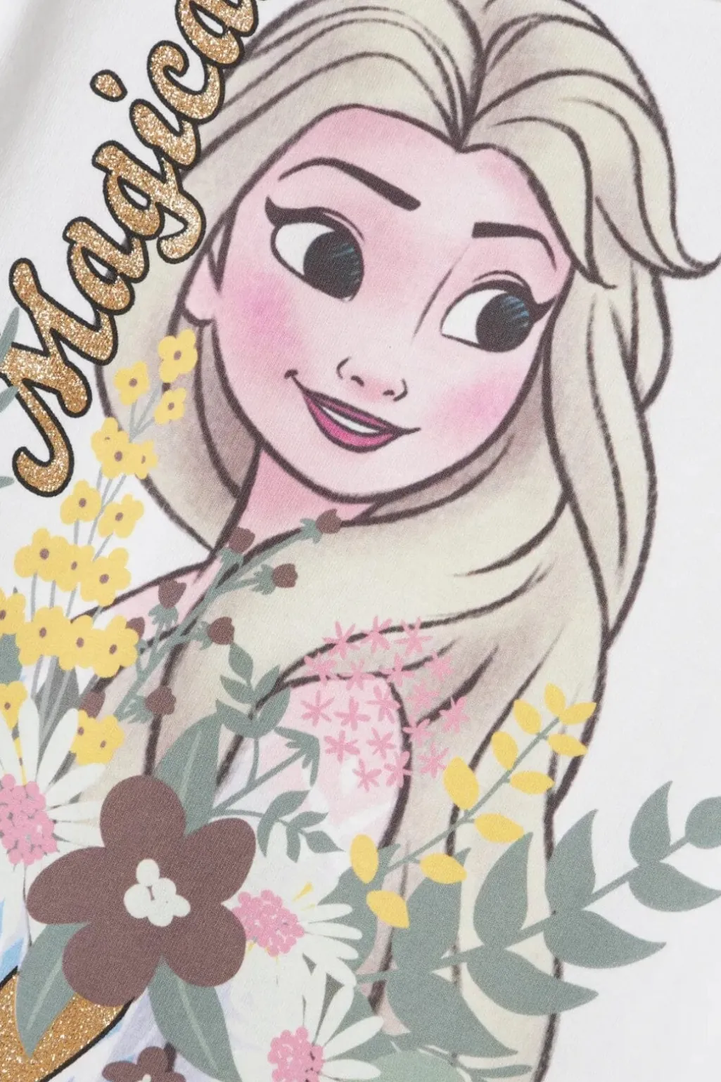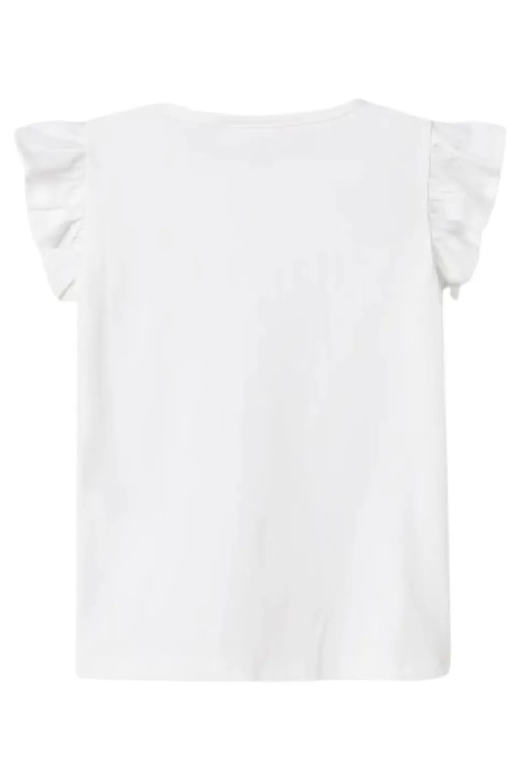 Hvid t-shirt med Elsa-print fra Name It. T-shirten har et blomstermotiv og glimmerdetaljer omkring printet samt flæser på de korte ærmer.