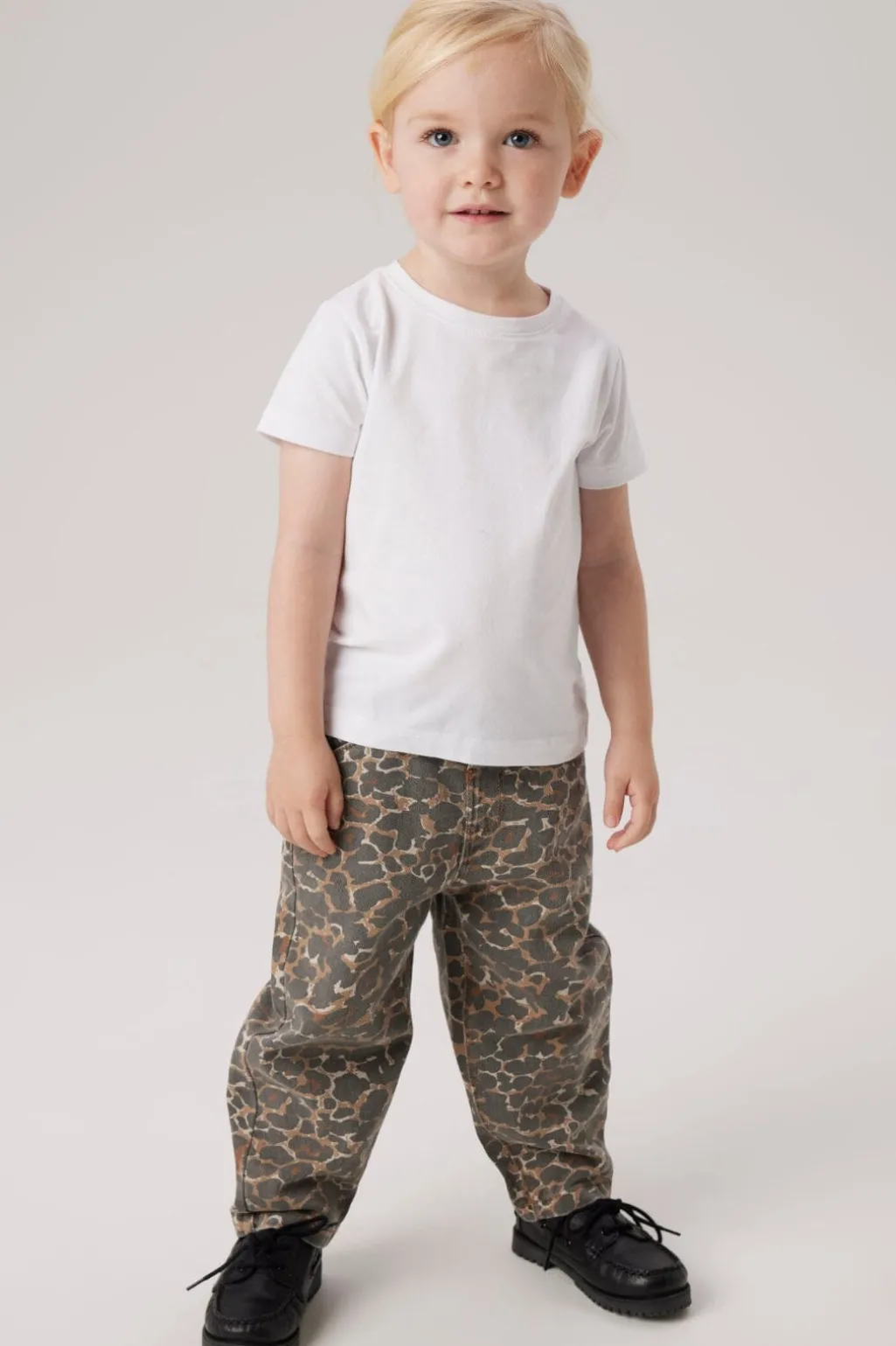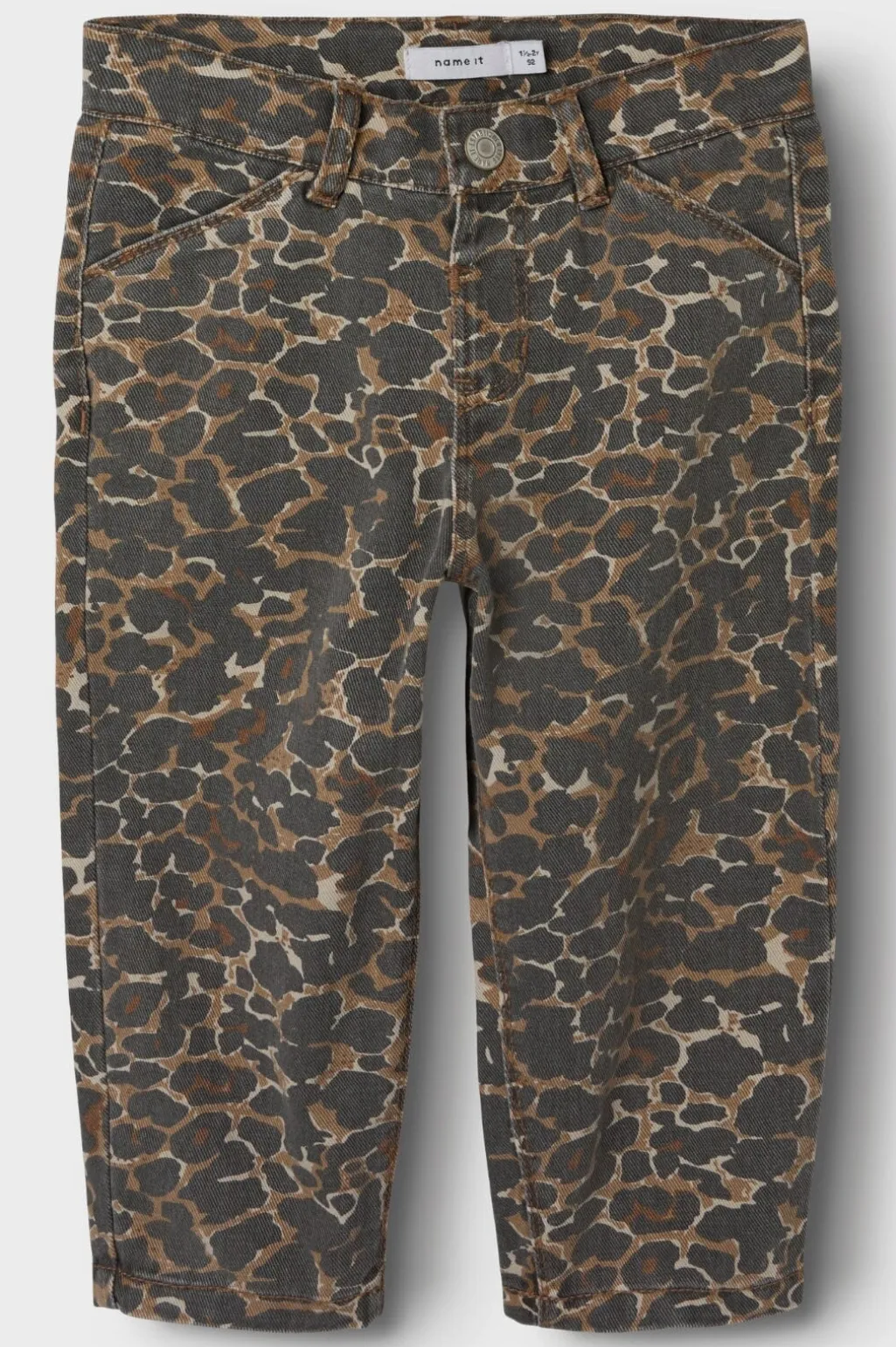 Twillbukser fra Name It med leopardmønster i beige og brune nuancer. Bukserne har en rummelig pasform og knaplukning ved taljen.