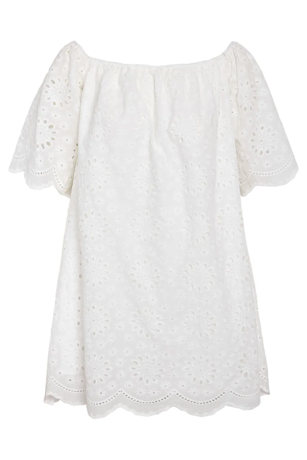 Hvid off-shoulder kjole fra Noisy May med broderie anglaise-mønster. Kjolen har korte, puffede ærmer og en bølget kant nederst.