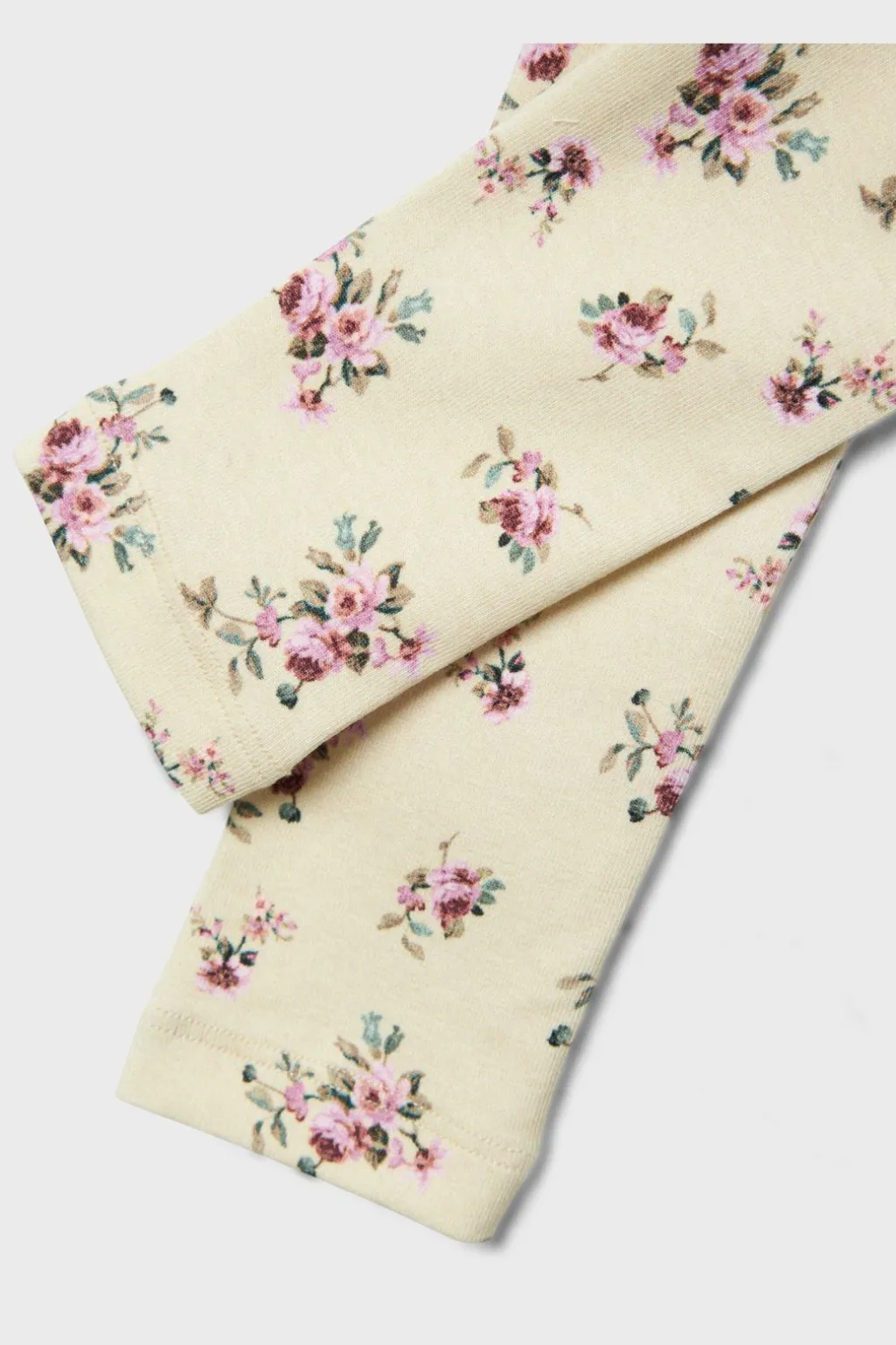 Beige leggings fra Name It med lyserøde og grønne blomster. Det fine blomsterprint dækker hele stoffet og giver leggingsene et let og legende udtryk.