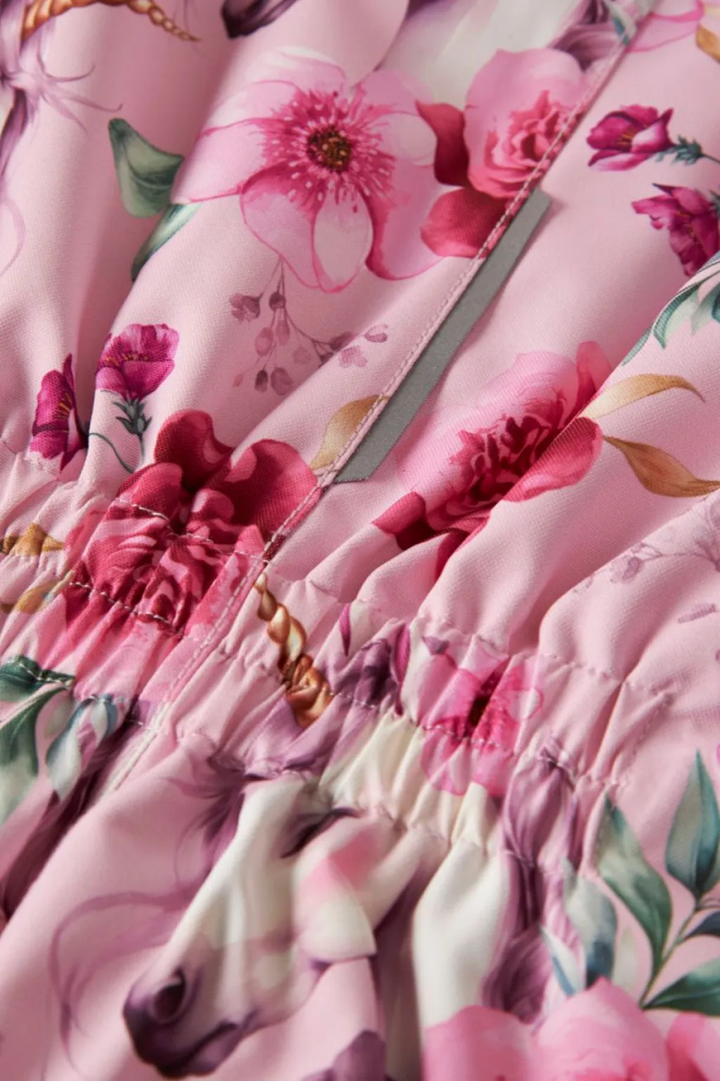 Lyserød flyverdragt fra Name It med blomster- og enhjørningsmønster. Dragten har en høj hals, lynlås og trykknapper samt hætte med pelskant.