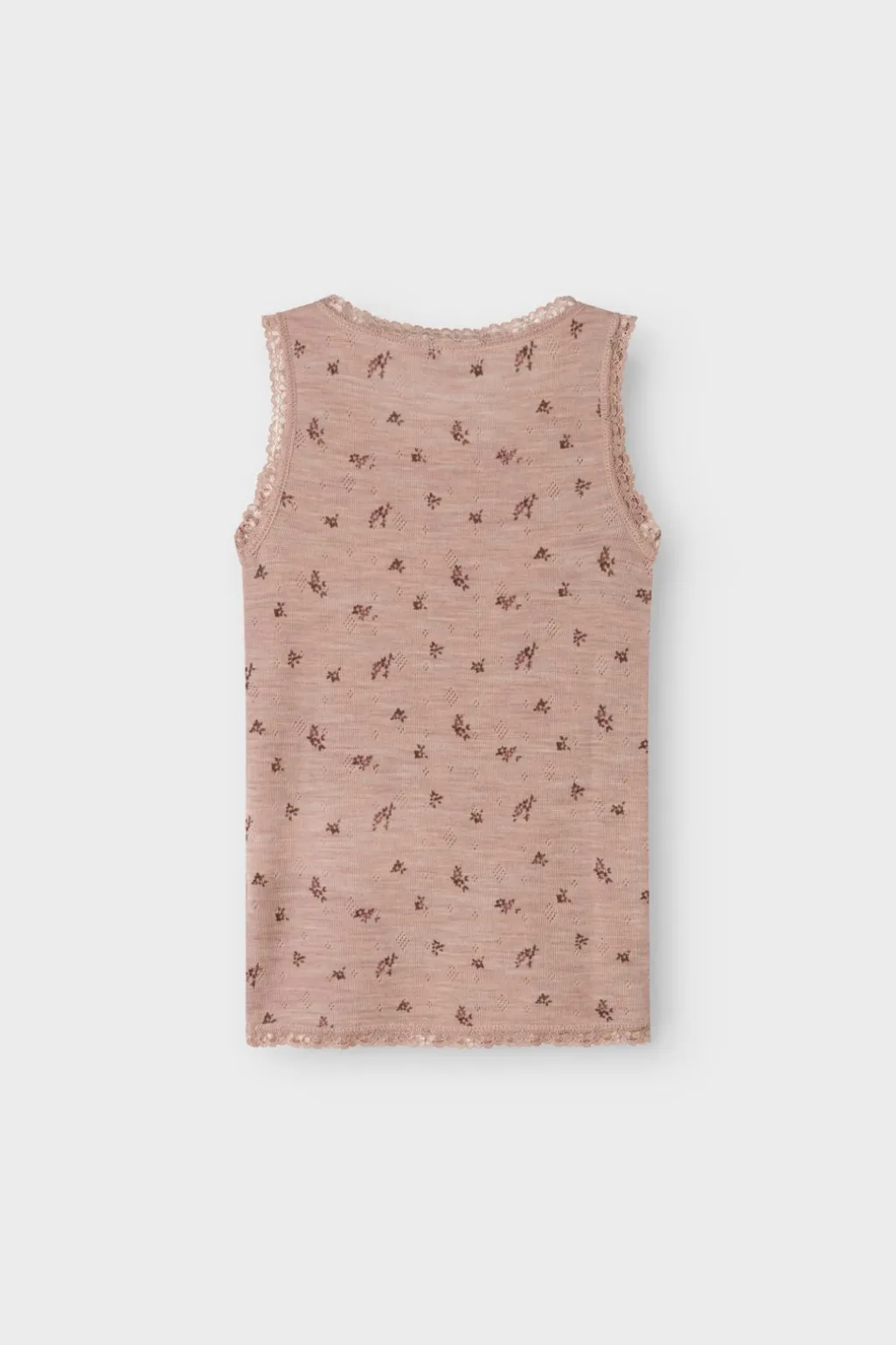 Grå tanktop fra Name It med små blomsterprint. Toppen har blondekanter langs halsudskæringen og ærmegab samt et hulmønster med tabte masker.