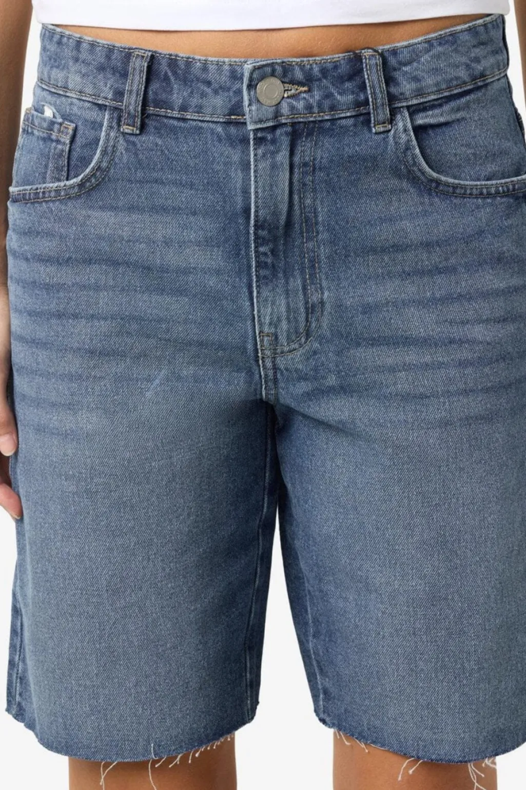 Løse shorts fra Noisy May i mellemblå denim. Shortsene har rå kanter forneden og et klassisk fem-lomme-design med almindelig taljehøjde.