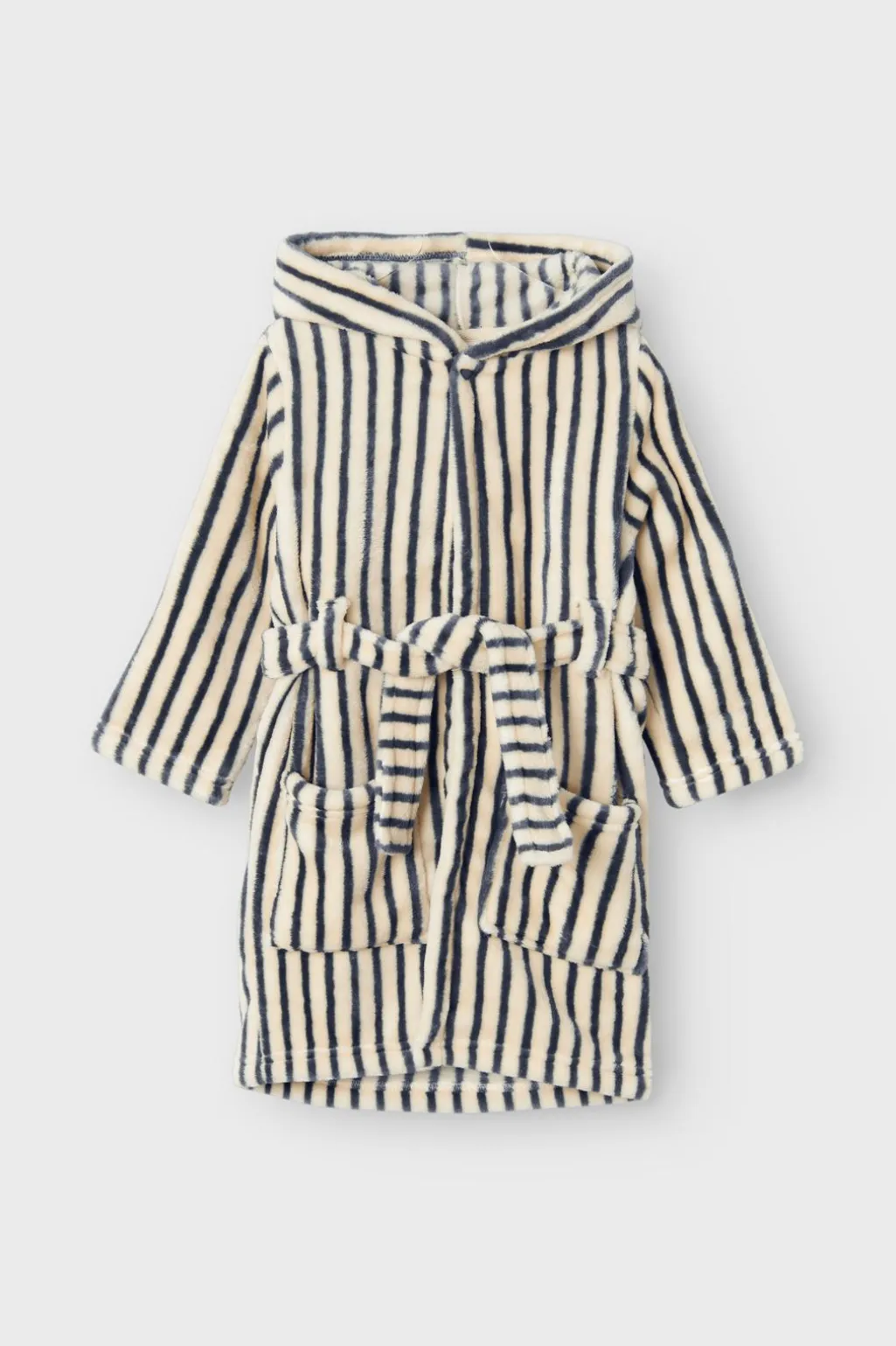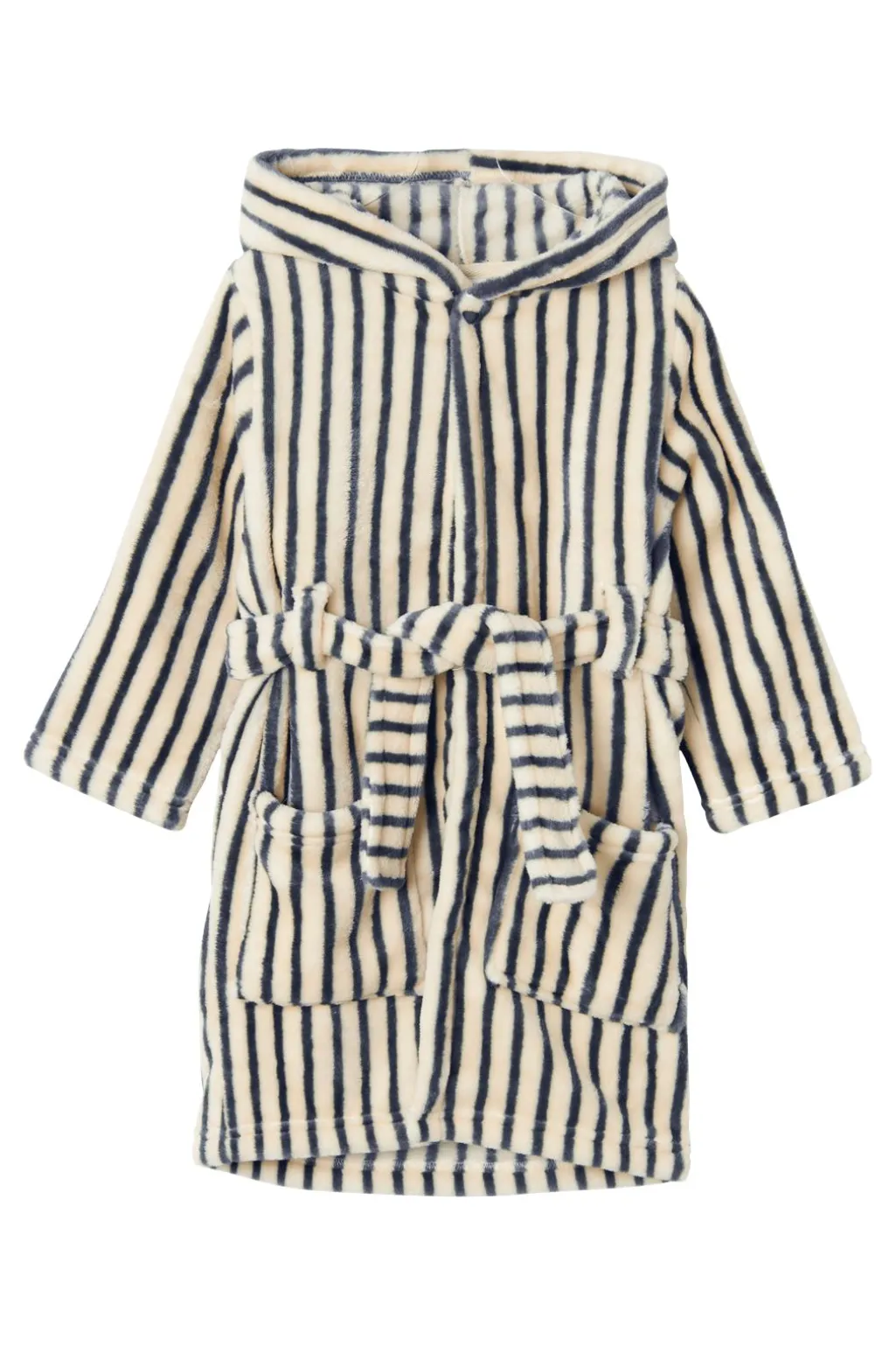 Stribet morgenkåbe fra Name It i mørk safir og cremefarvet fleece. Knælang model med hætte, to forlommer og et aftageligt bælte til at justere pasformen.