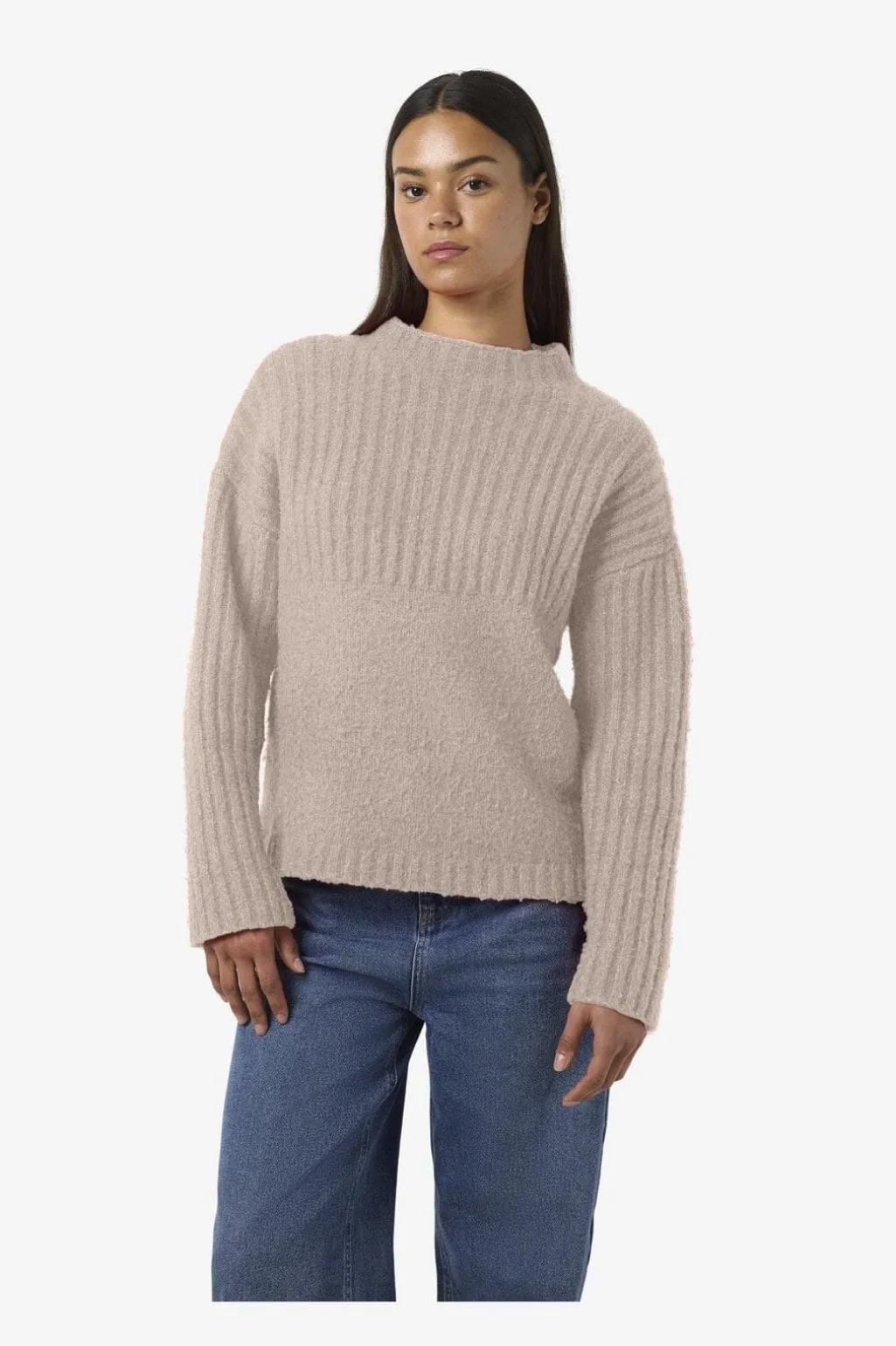 Striktrøje fra Noisy May i beige meleret farve. Trøjen har en høj hals, løs pasform og ribbede strikdetaljer.