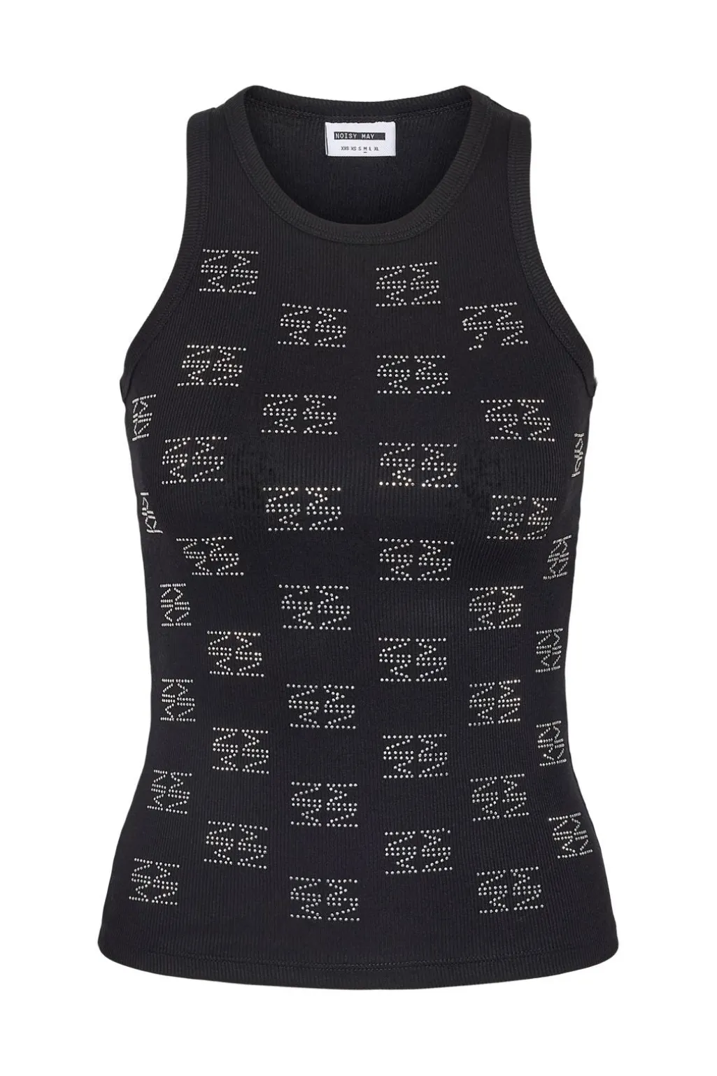 Sort tanktop fra Noisy May med slim fit-pasform og pailletdetaljer. Materialet er en blanding af polyester, viskose og elastan.