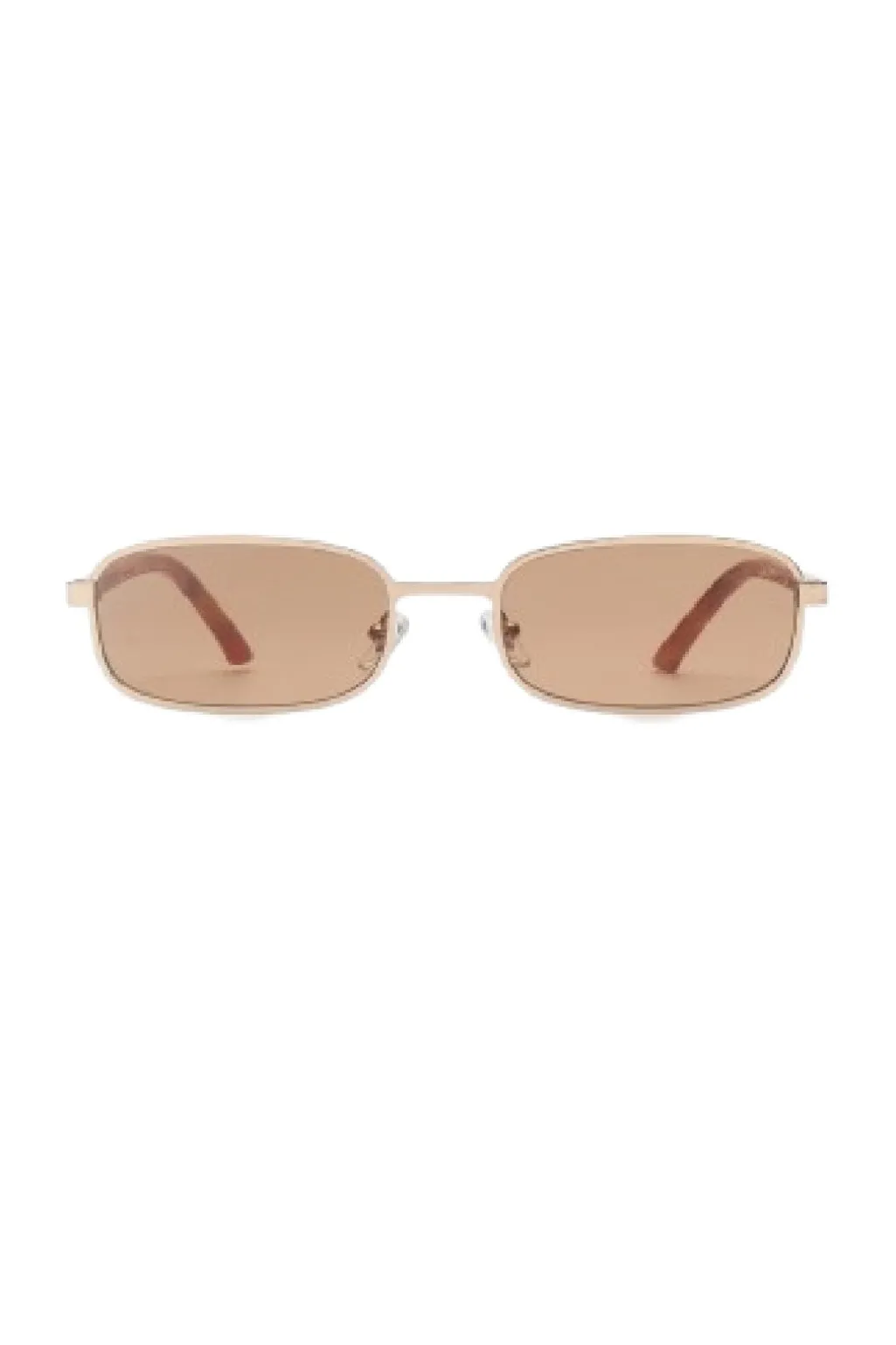 Solbriller fra A. Kjærbede med gylden metalramme og brune glas. Stellet har en bred aviatorform med en robust konstruktion.