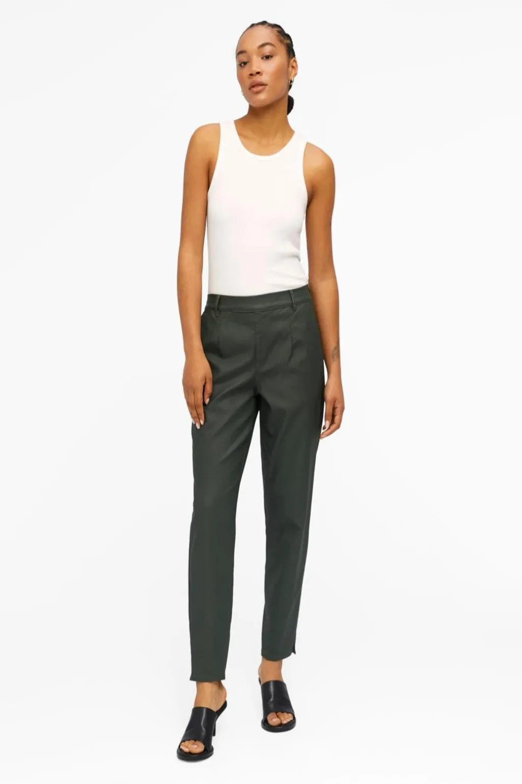 Bukser fra Object med coated overflade i en mørkegrøn farve. Den belagte finish giver bukserne et særligt look, og den regular fit sikrer en behagelig pasform.
