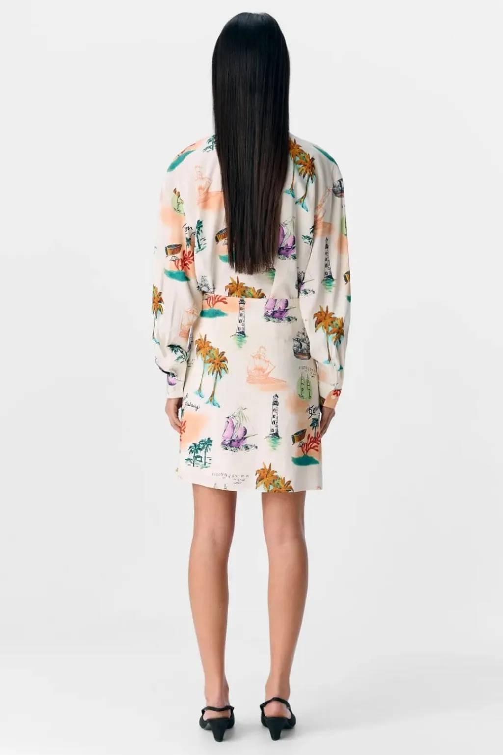 Kort nederdel fra Object med nautisk print på cremehvid bund. Den vævede nederdel har høj talje og skjult lynlås i siden.