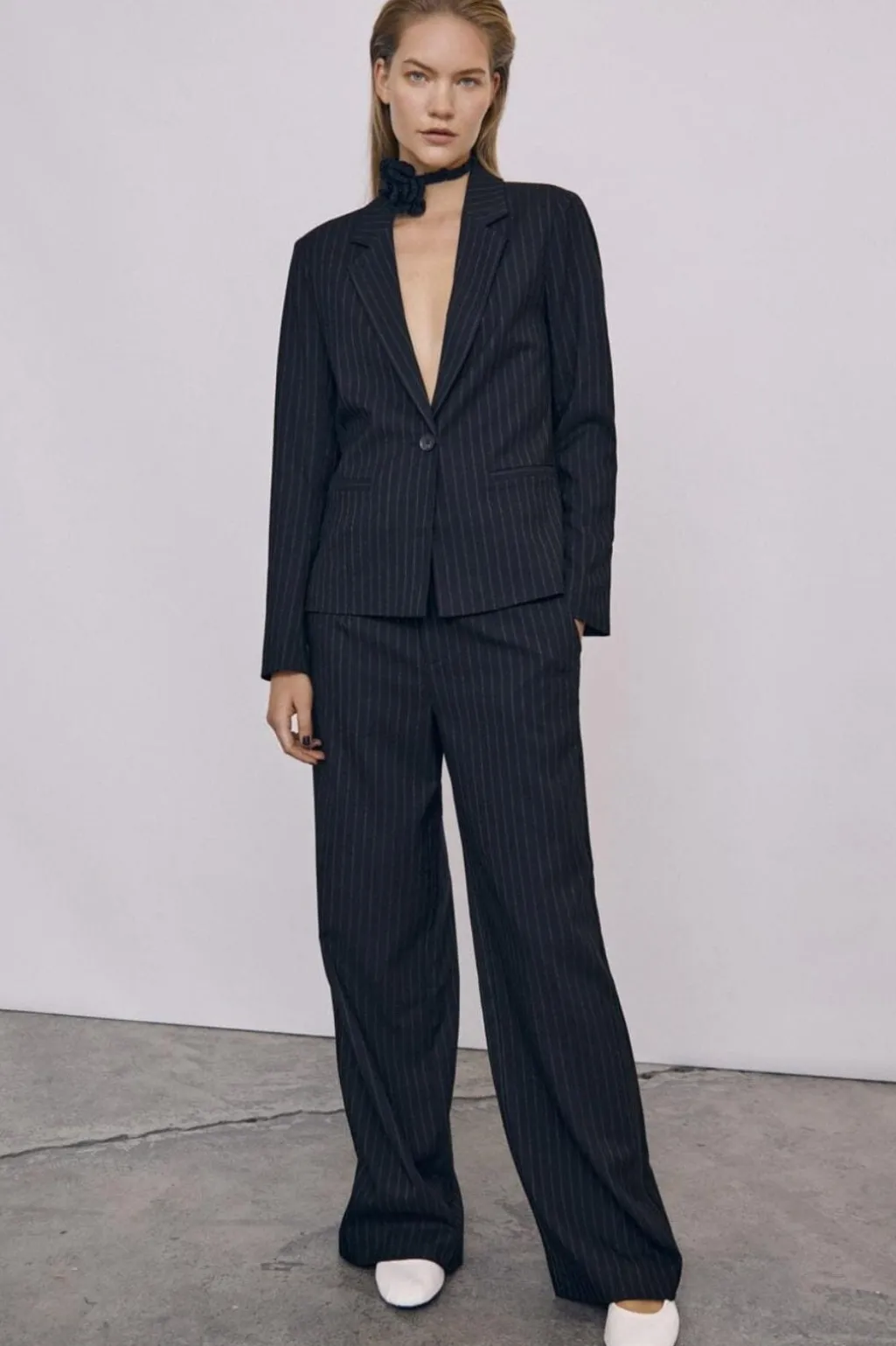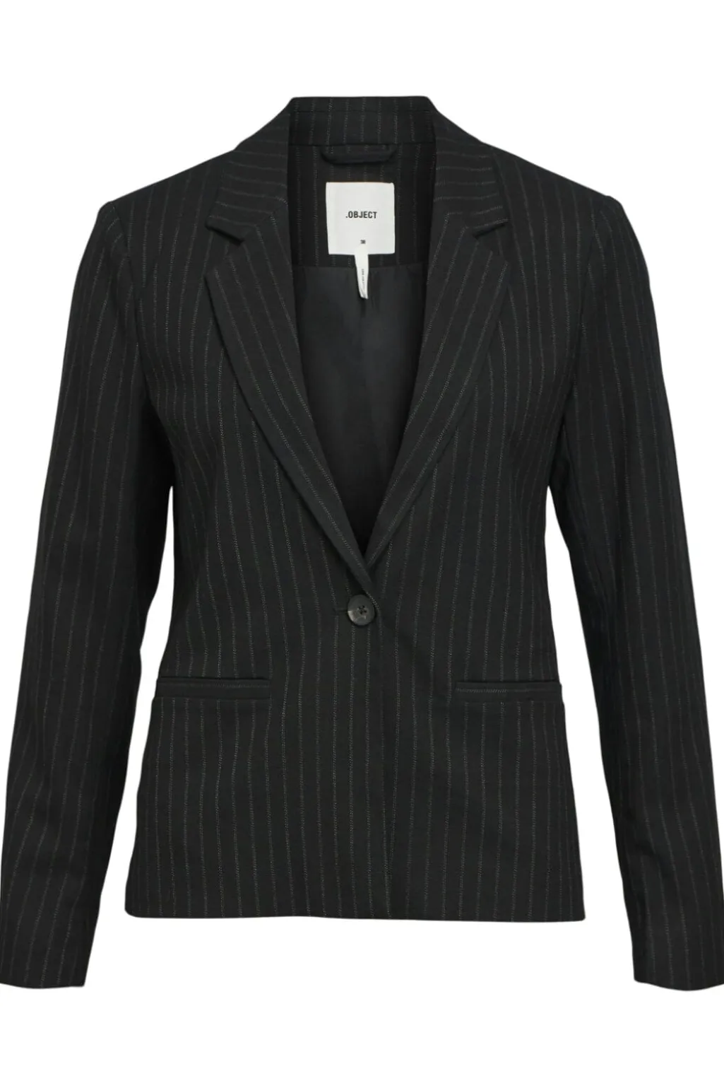 Sort-grå blazer fra Object med pinstripe-mønster. Den har en skjortekrave, knaplukning foran og sidelommer. Blazeren er fremstillet i vævet materiale med standardpasform.