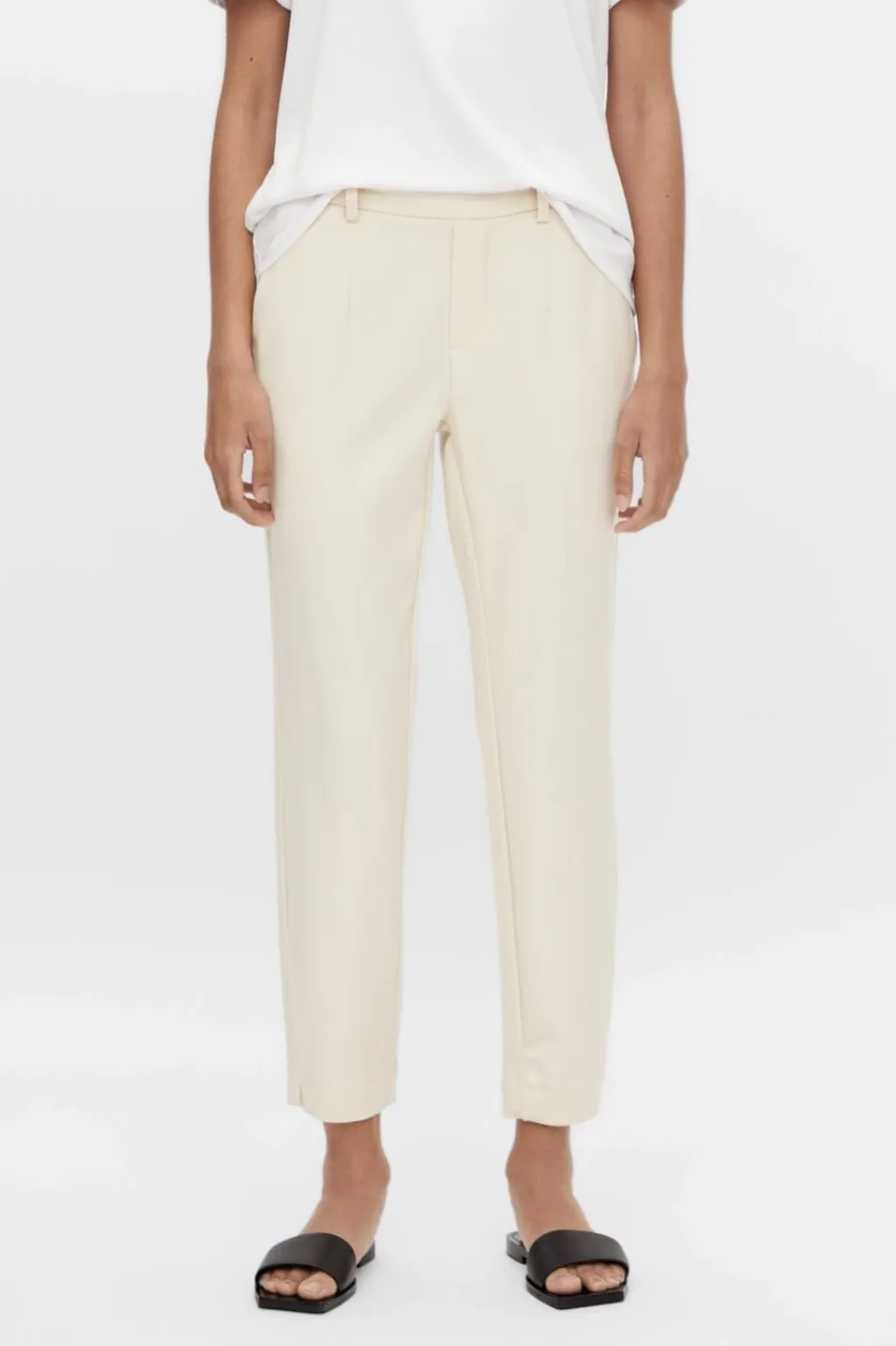 Slimbukser fra Object i sandshell-farve. Bukserne har en mellemhøj talje med elastisk linning og sidelommer. Den slanke pasform går til anklen.