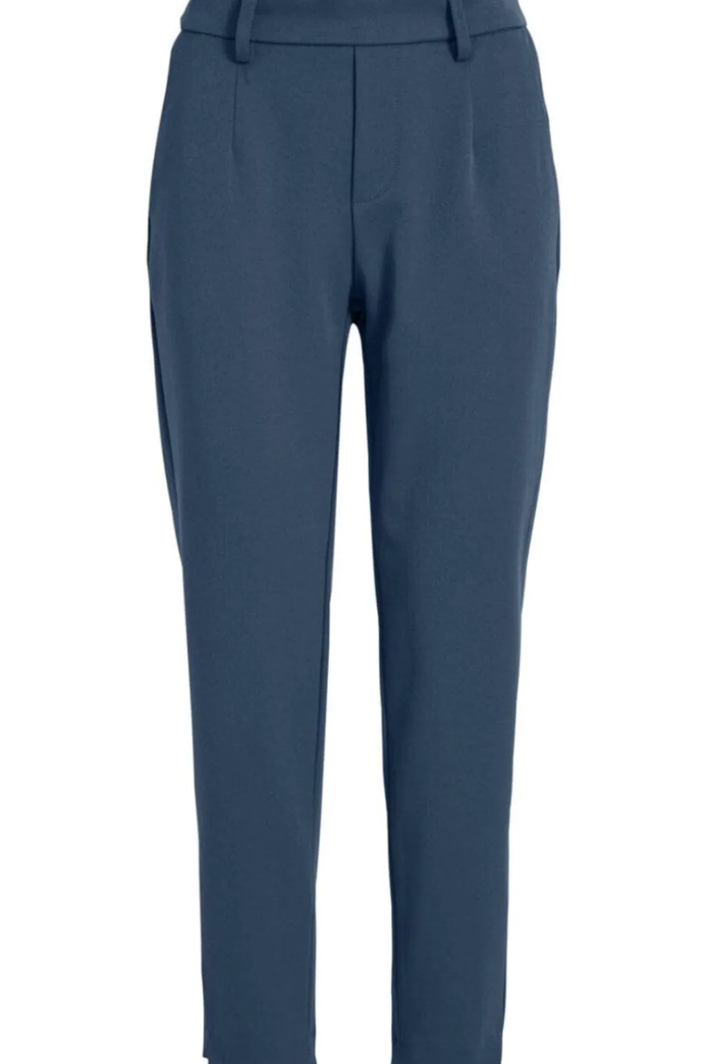Mørkeblå slim bukser fra Object med elastisk linning. Bukserne har ankellængde og sidelommer. Stoffet har en glat overflade i mørk denim.