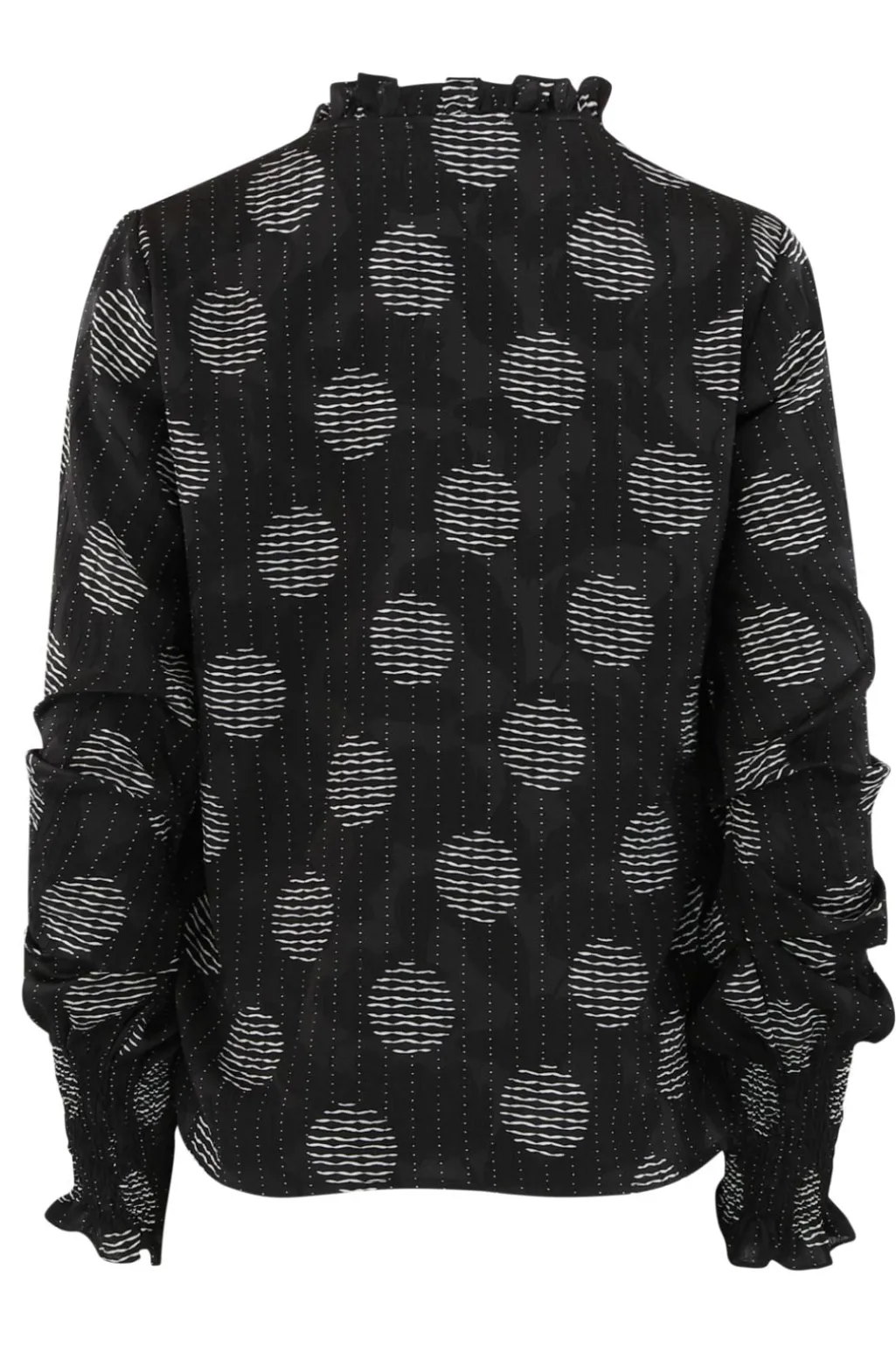 Sort bluse fra Continue med hvidt cirkelmønster. Blusen har v-hals, lange ærmer og flæsedetaljer. Mønsteret består af stribede og solide cirkler på sort baggrund.