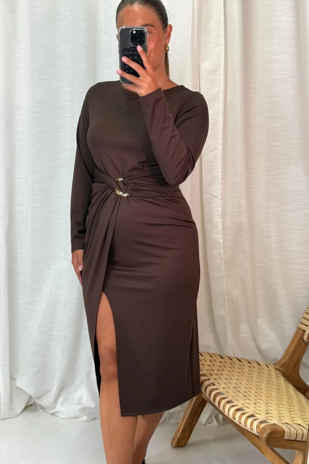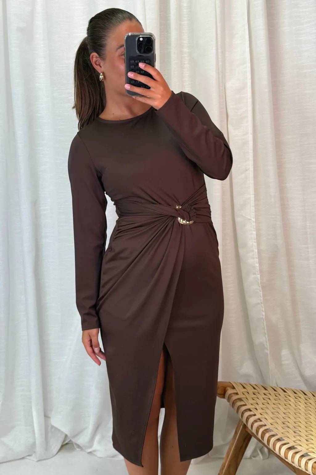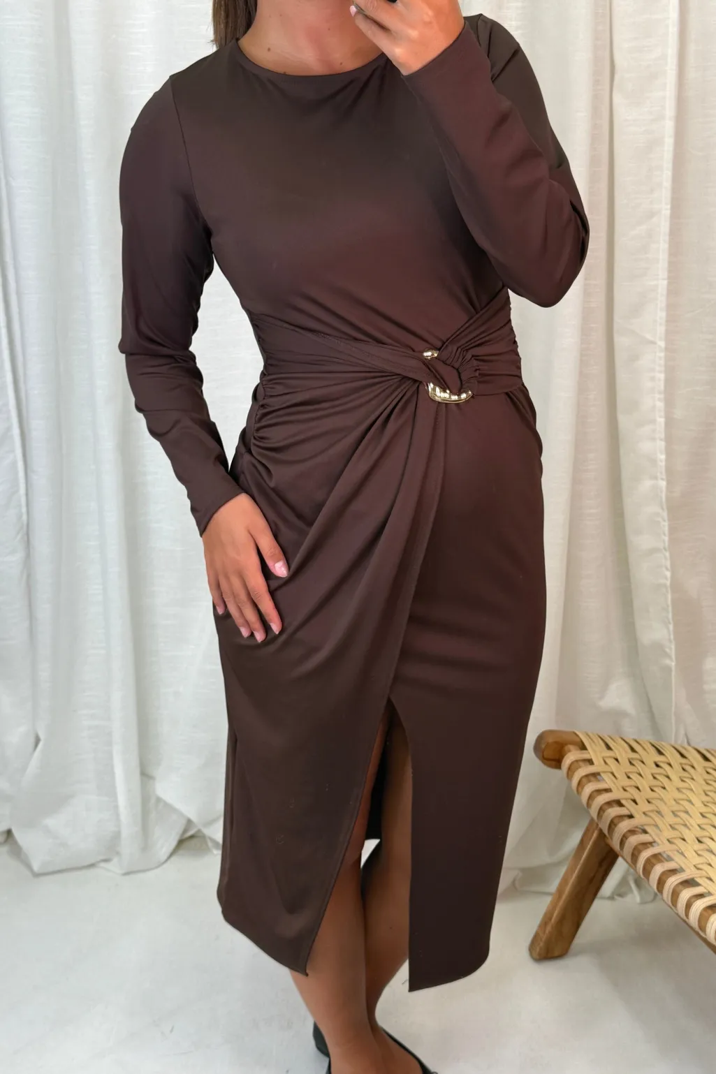 Mørkebrun kjole fra A-bee. Kjolen passer til både bryllupper, festlige begivenheder og formelle anledninger med sine detaljer og snit.