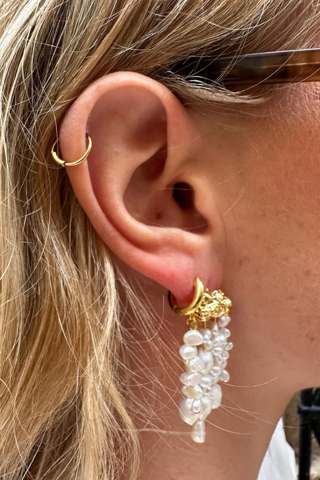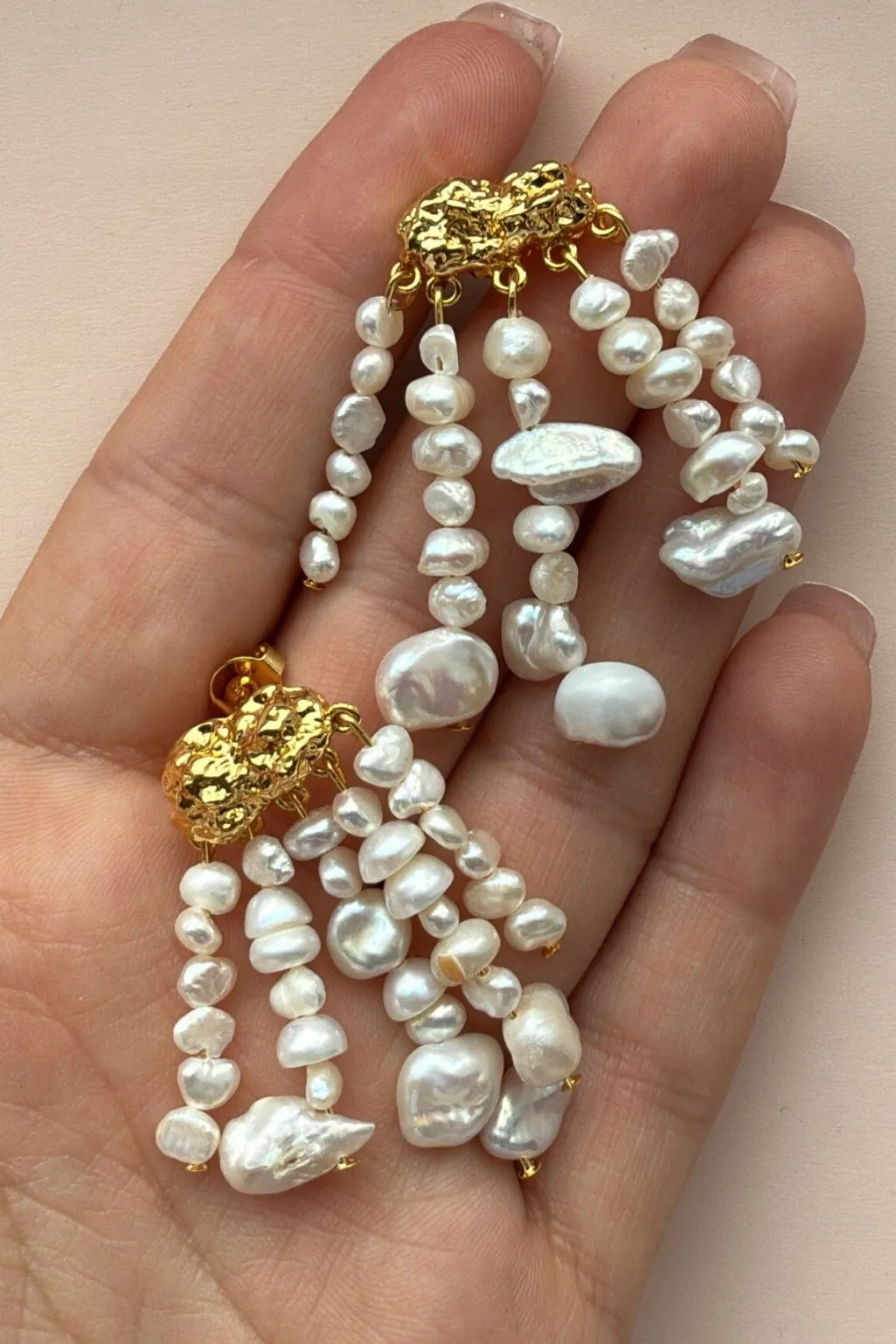 Forgyldte ørestik fra Mellow Moon med fem rækker af perler i forskellige størrelser. Den gyldne top kombineres med hvide og cremefarvede perler, der skaber en fin bevægelse.