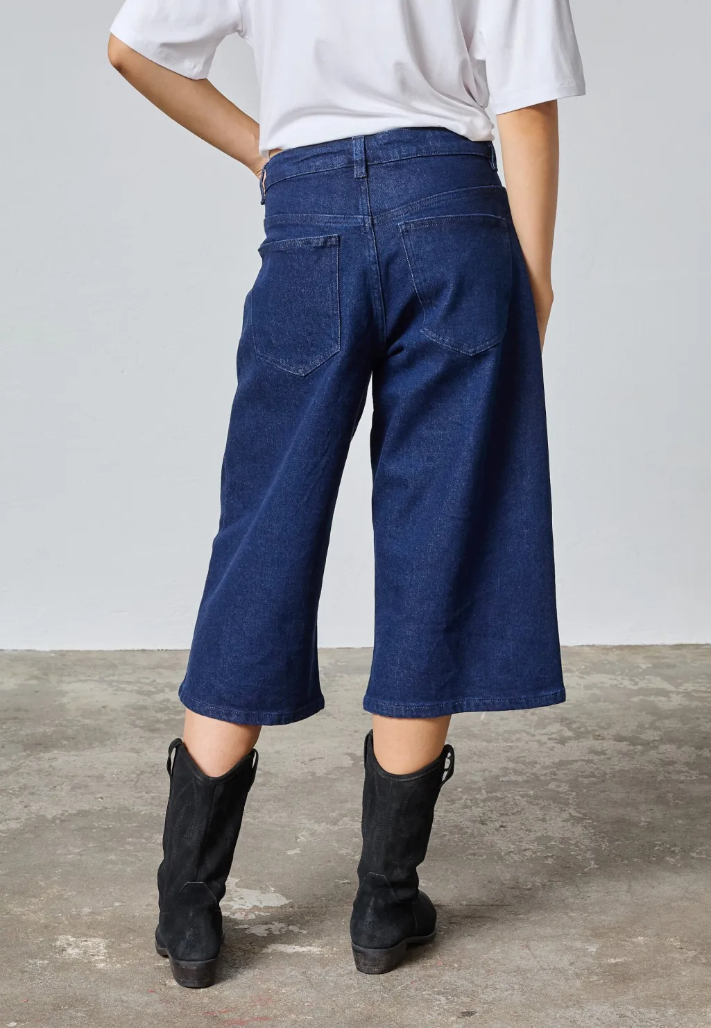 Denimshorts fra Sisters Point i mørkeblå denim. Shortsene har en løs pasform med lige ben og en længde til midt på læggen.