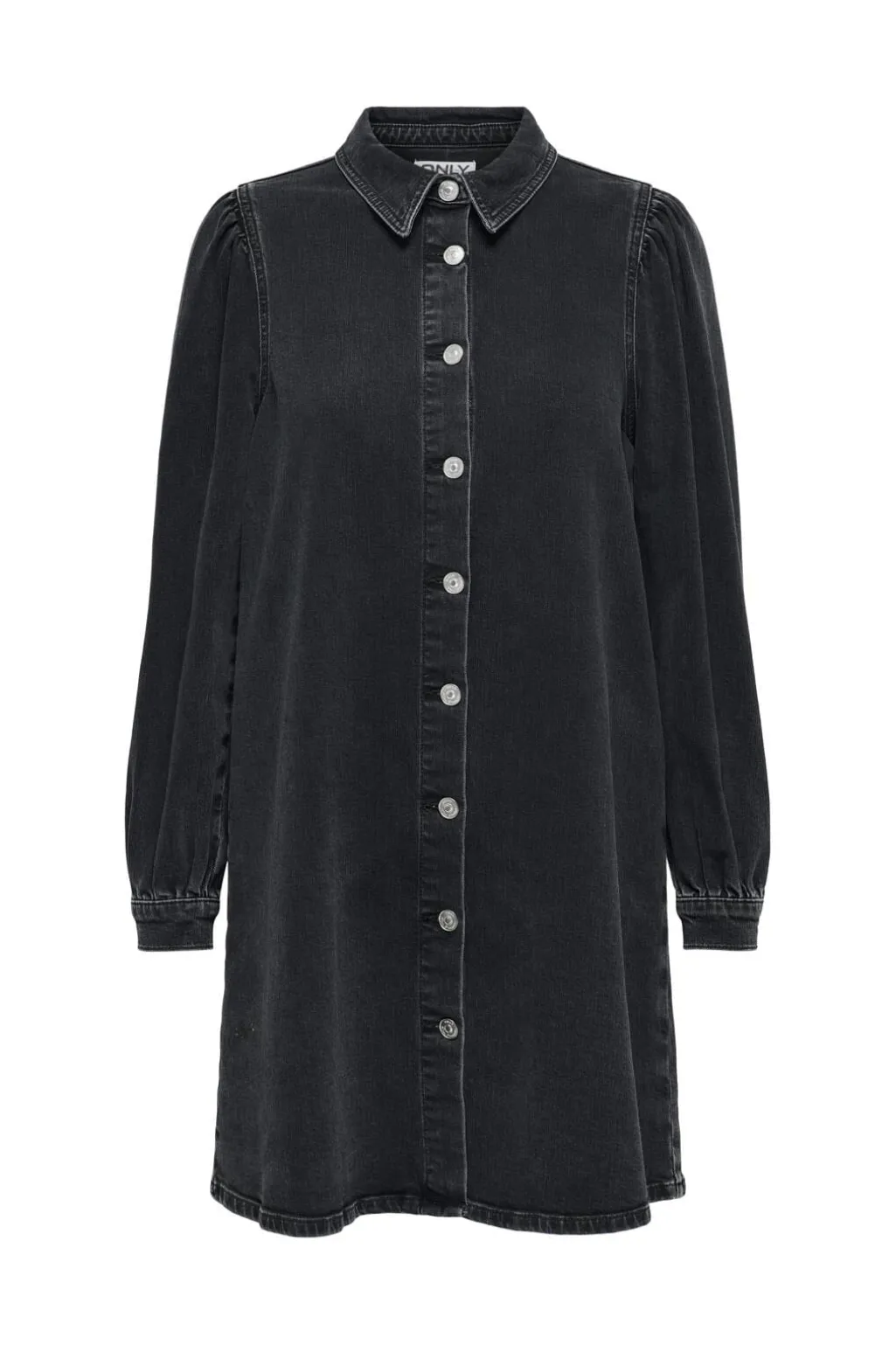 Denimkjole fra Only i vasket sort. Kjolen har skjortekrave, knaplukning foran og lange pufærmer med manchetter. Den ekstra korte længde giver et særegent udtryk.