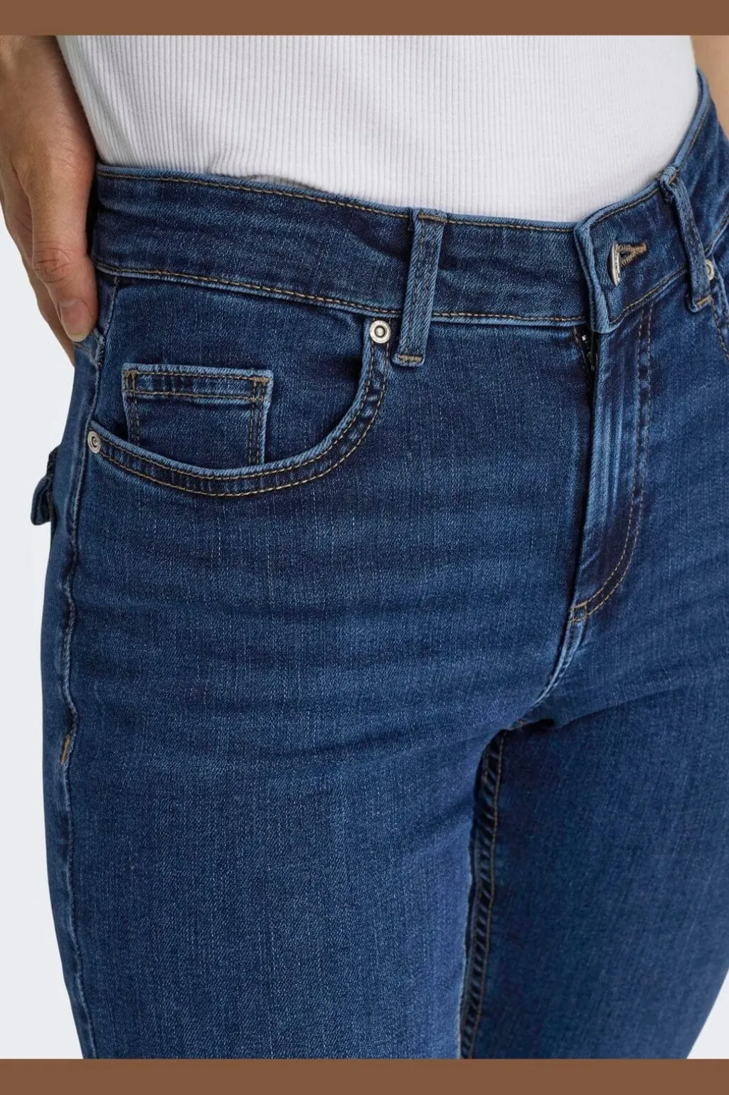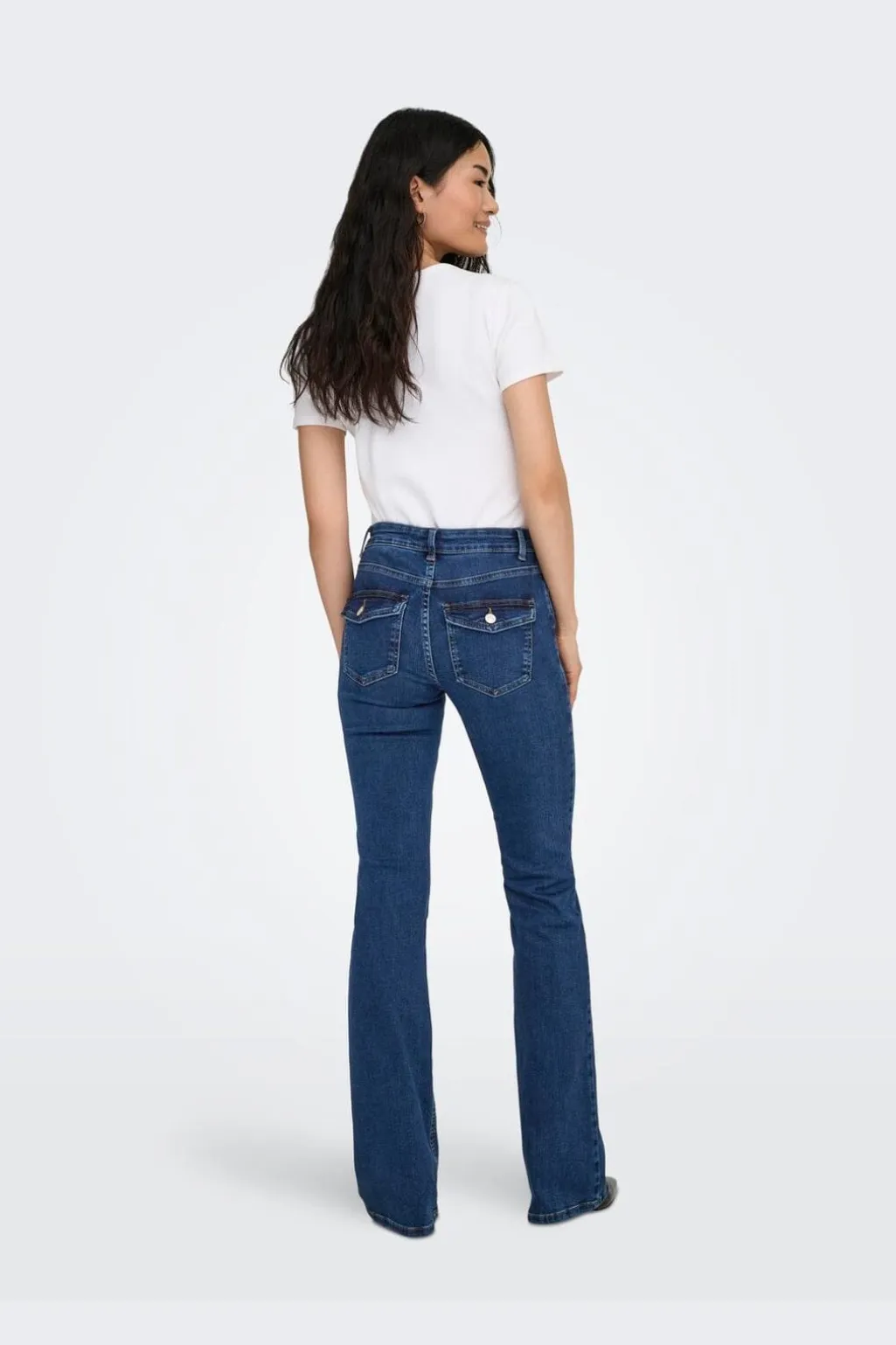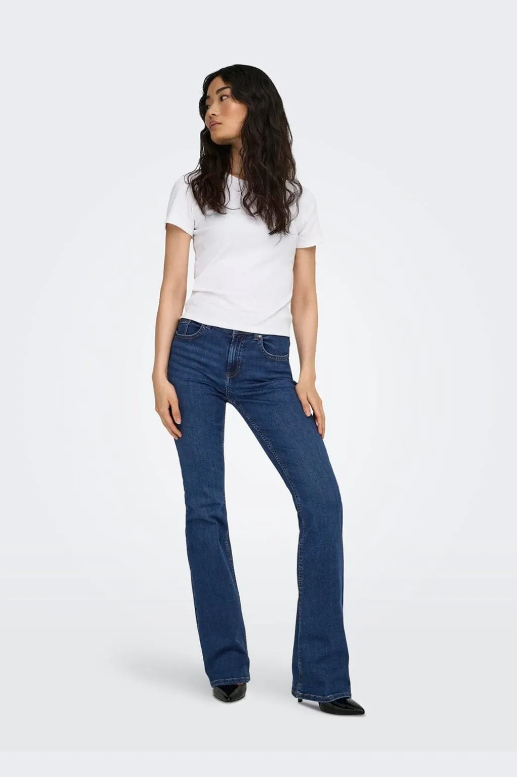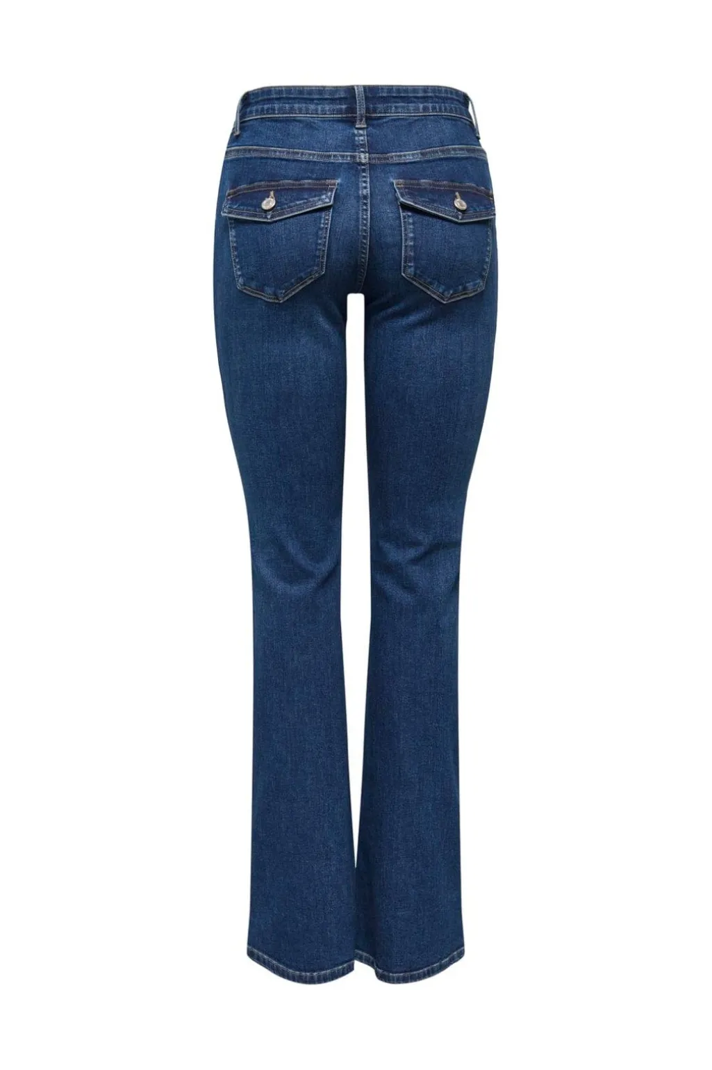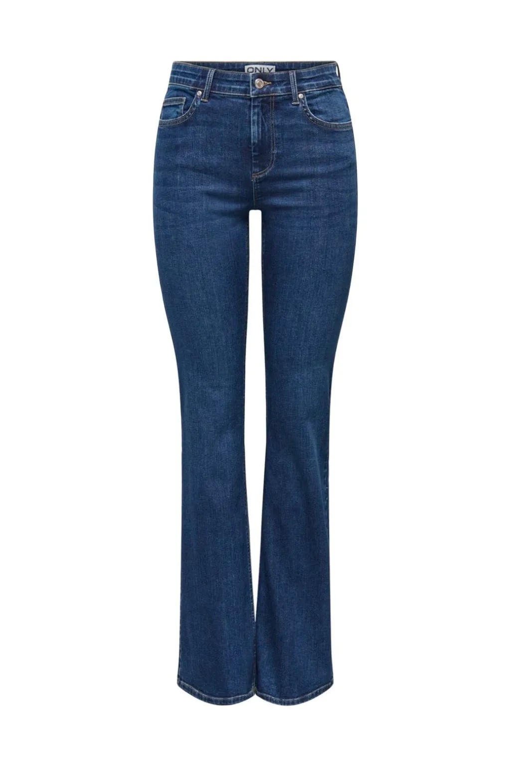 Flared jeans fra Only i mørkeblå denim. Jeansene har en slim fit omkring hofterne, der fortsætter fra knæet og går over i flared ben.