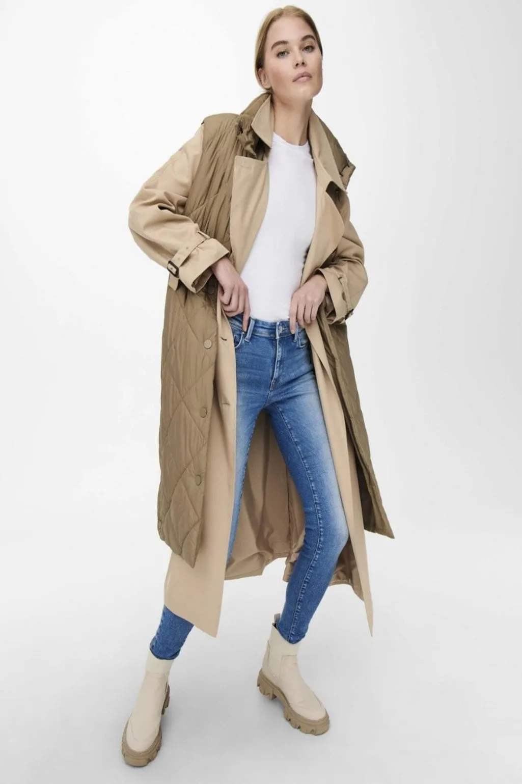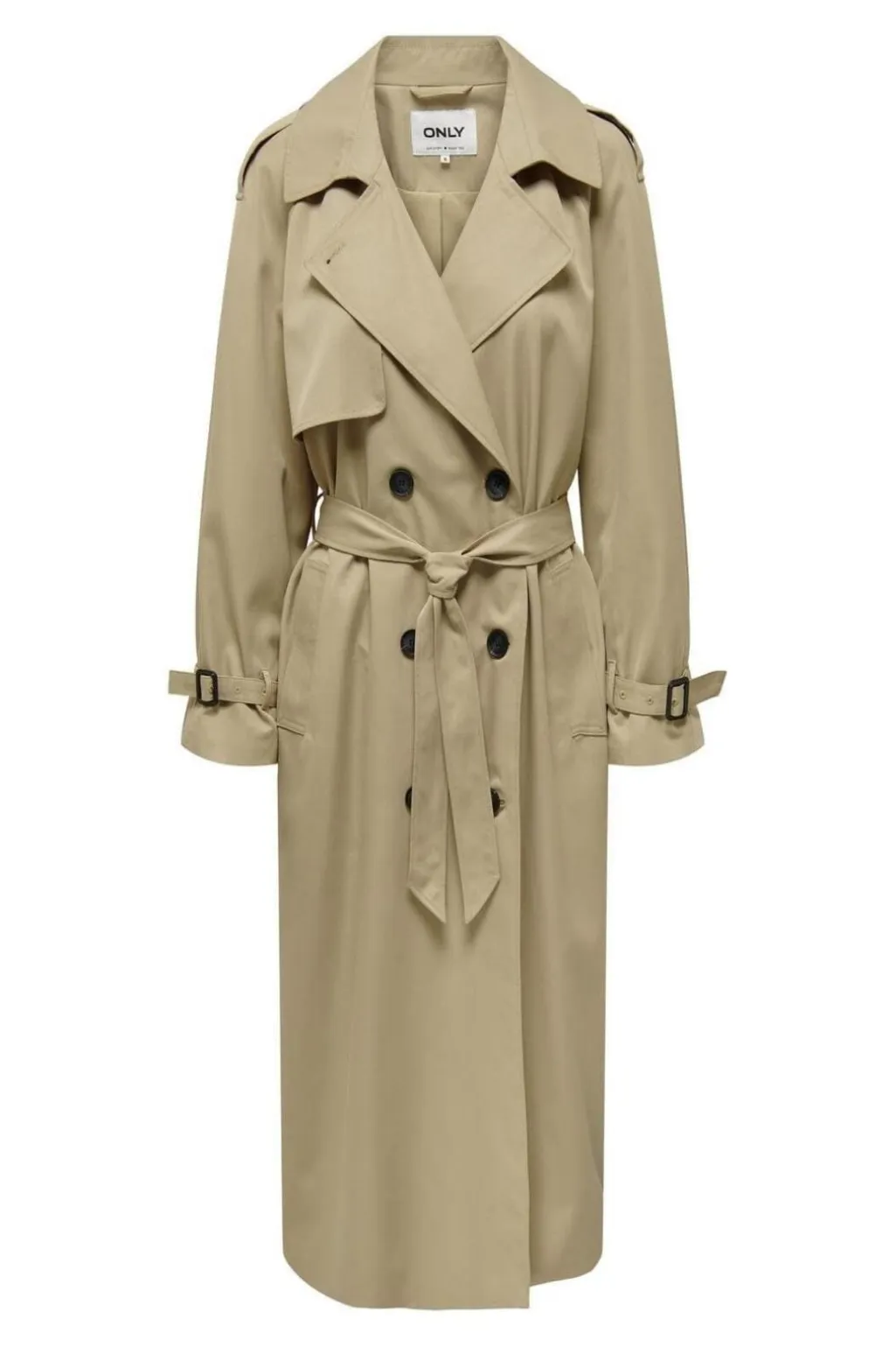Beige trenchcoat med revers og dobbeltknaplukning fra Only. Den lange frakke har et klassisk snit med brede revers og et matchende bælte.