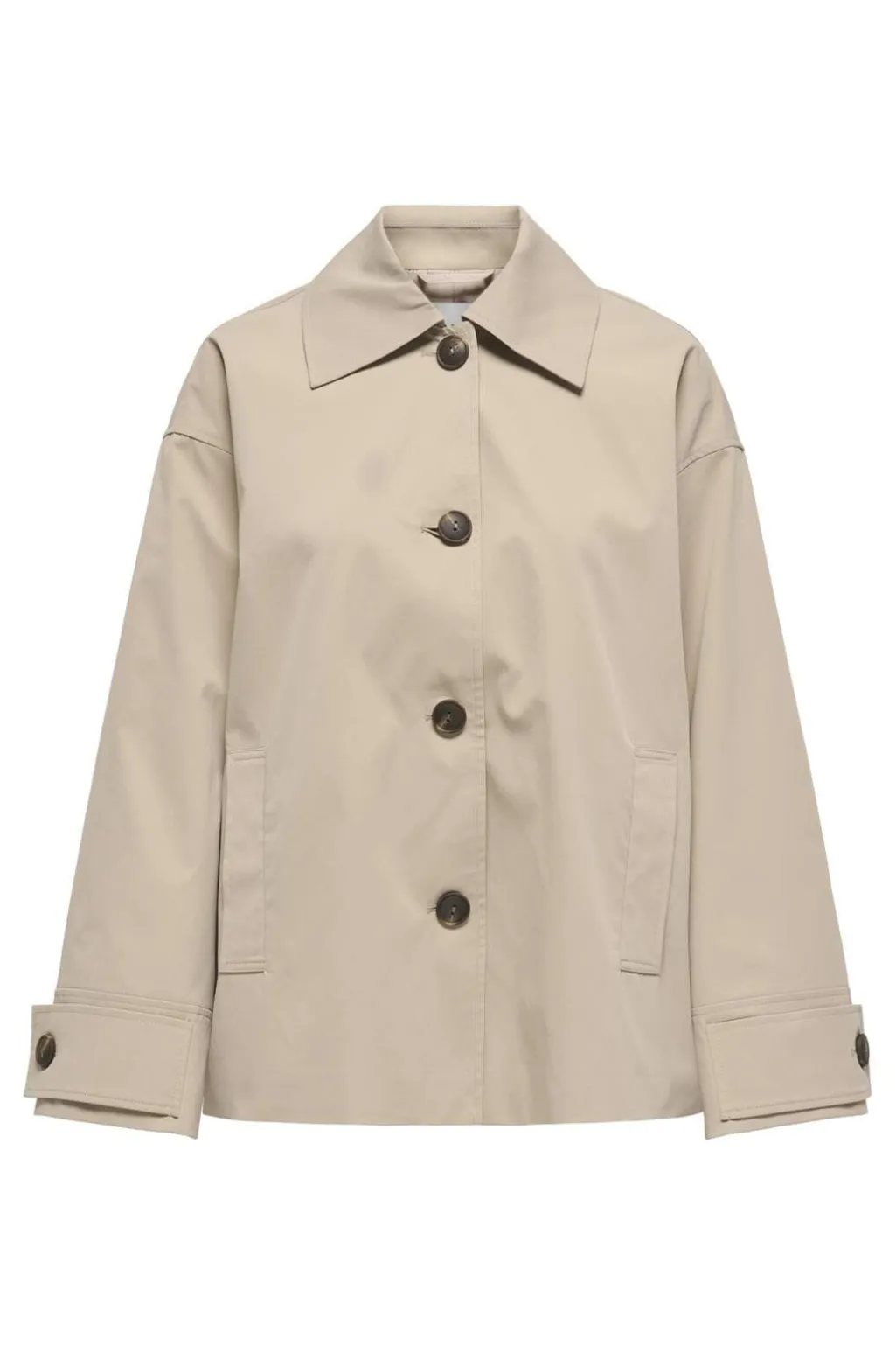 Kort jakke fra Only i en varm humusfarve. Jakken har en V-halsudskæring og lange ærmer med justerbare manchetter. Knapperne foran gør den nem at tage af og på.