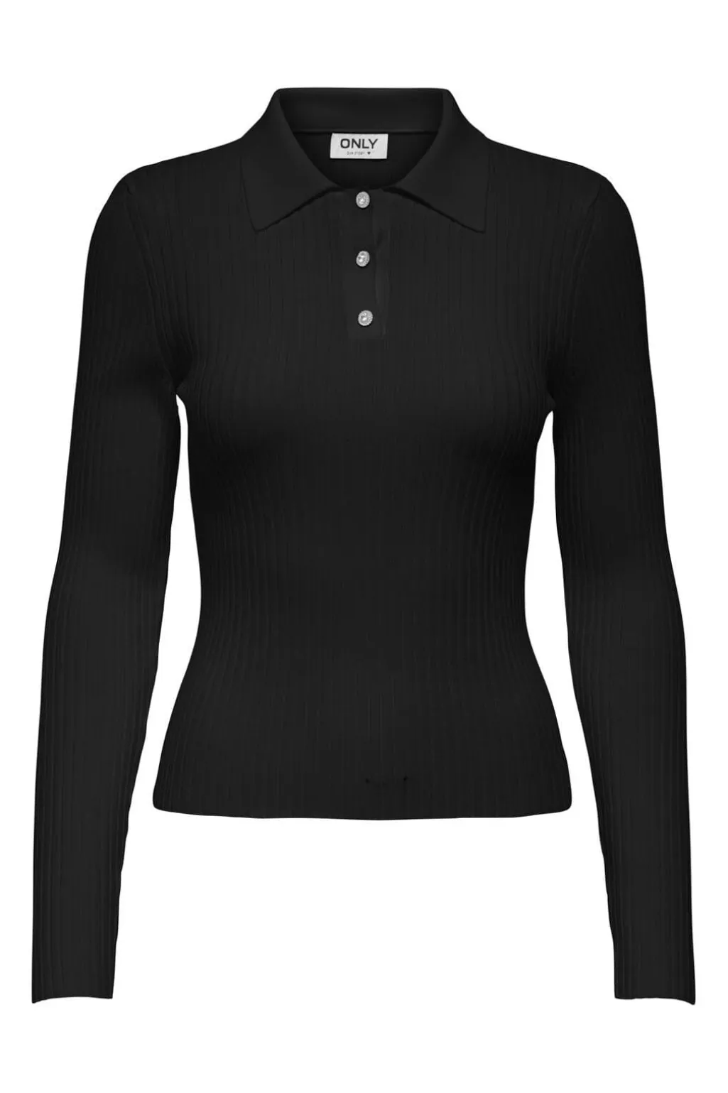 Sort ribstrikket polo-top fra Only med lange ærmer. Toppen har en klassisk polokrave med fire knapper og en regular pasform, der giver god bevægelsesfrihed.