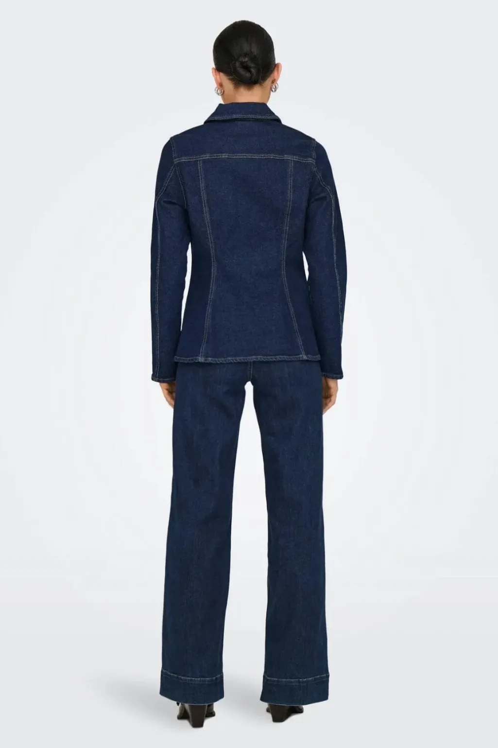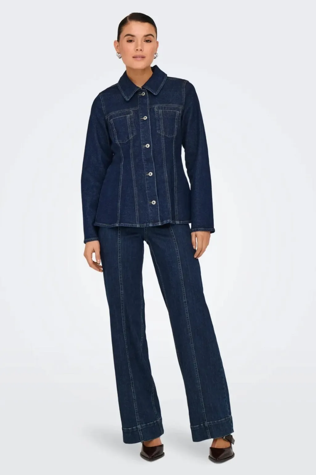 Mørkeblå denimjakke fra Only med figursyet pasform. Jakken har lange ærmer, skjortekrave og knapper hele vejen ned. To brystlommer og dekorative syninger giver jakken et klassisk udtryk.