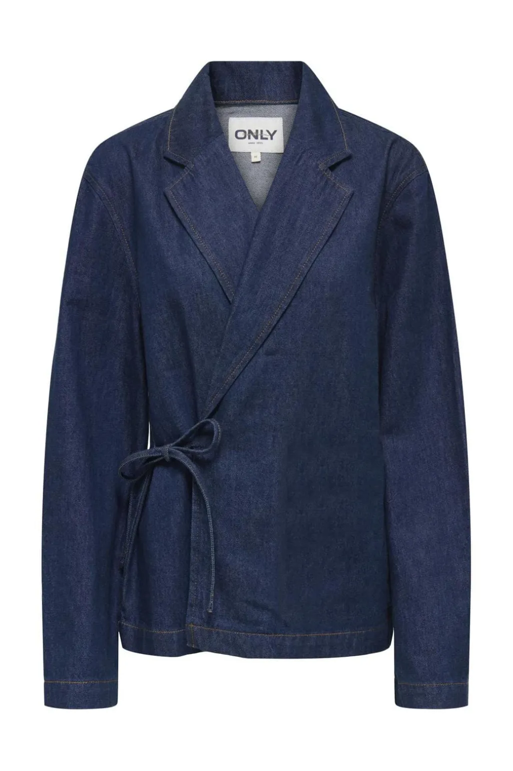 Mørkeblå denimjakke fra Only med sløjfe i taljen. Jakken har en oversized pasform med skjortekrave og lange ærmer. Sløjfen kan bindes foran eller i siden.