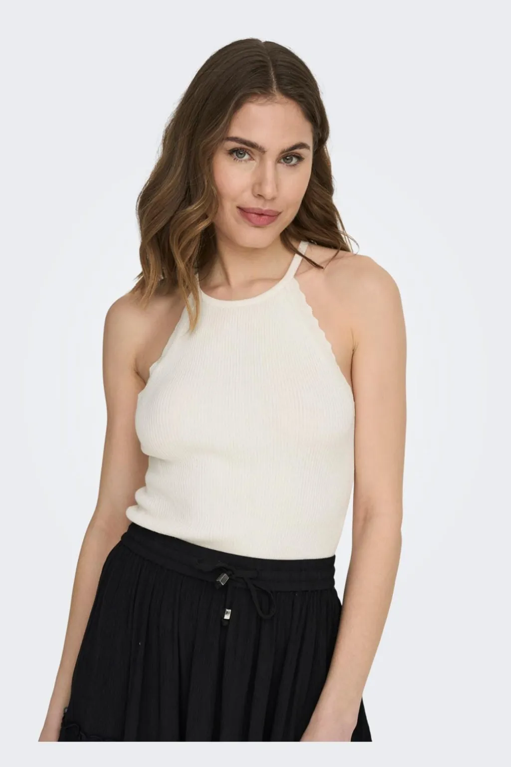 Strikket top fra Only i cremehvid Cloud Dancer-farve. Toppen har en ribbet tekstur og et halterneck-design med bølgede kanter. Den ærmeløse model har en lige pasform.