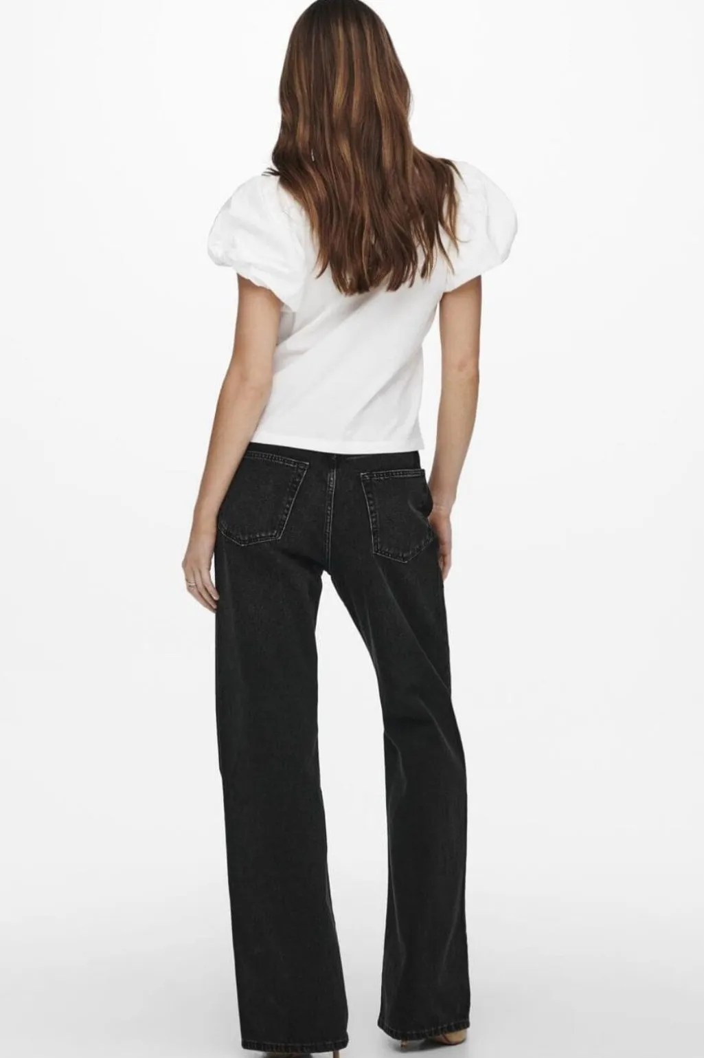 Sorte jeans fra Only med høj talje og bred benåbning. Bukserne har en loose fit-pasform og ankellængde med praktiske baglommer og lynlåslukning.