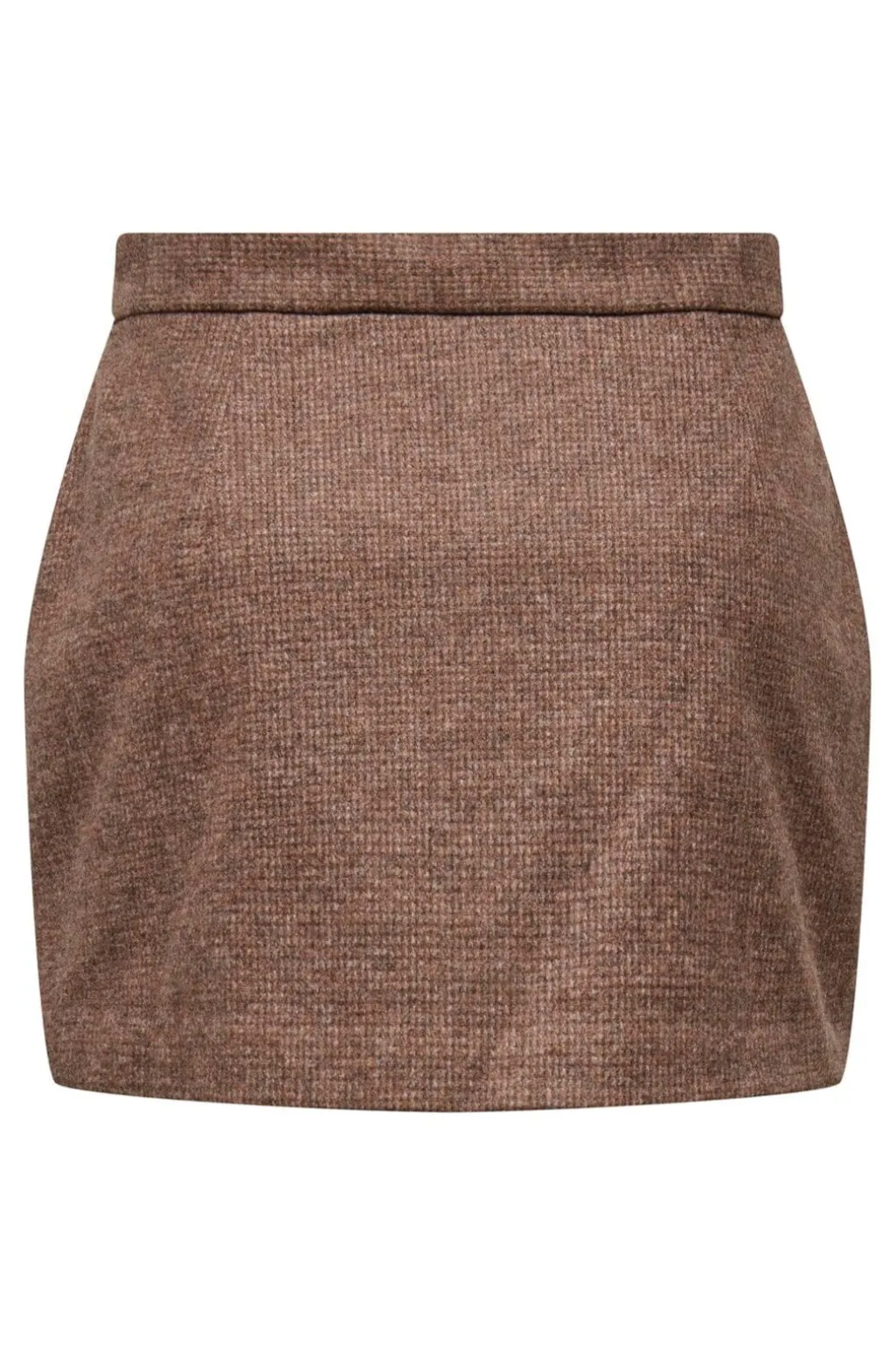 Kort, ternet nederdel fra Only i kastanjebrun med småternet mønster. Nederdelen har en regulær taljehøjde og lukkes med lynlås og knapper.