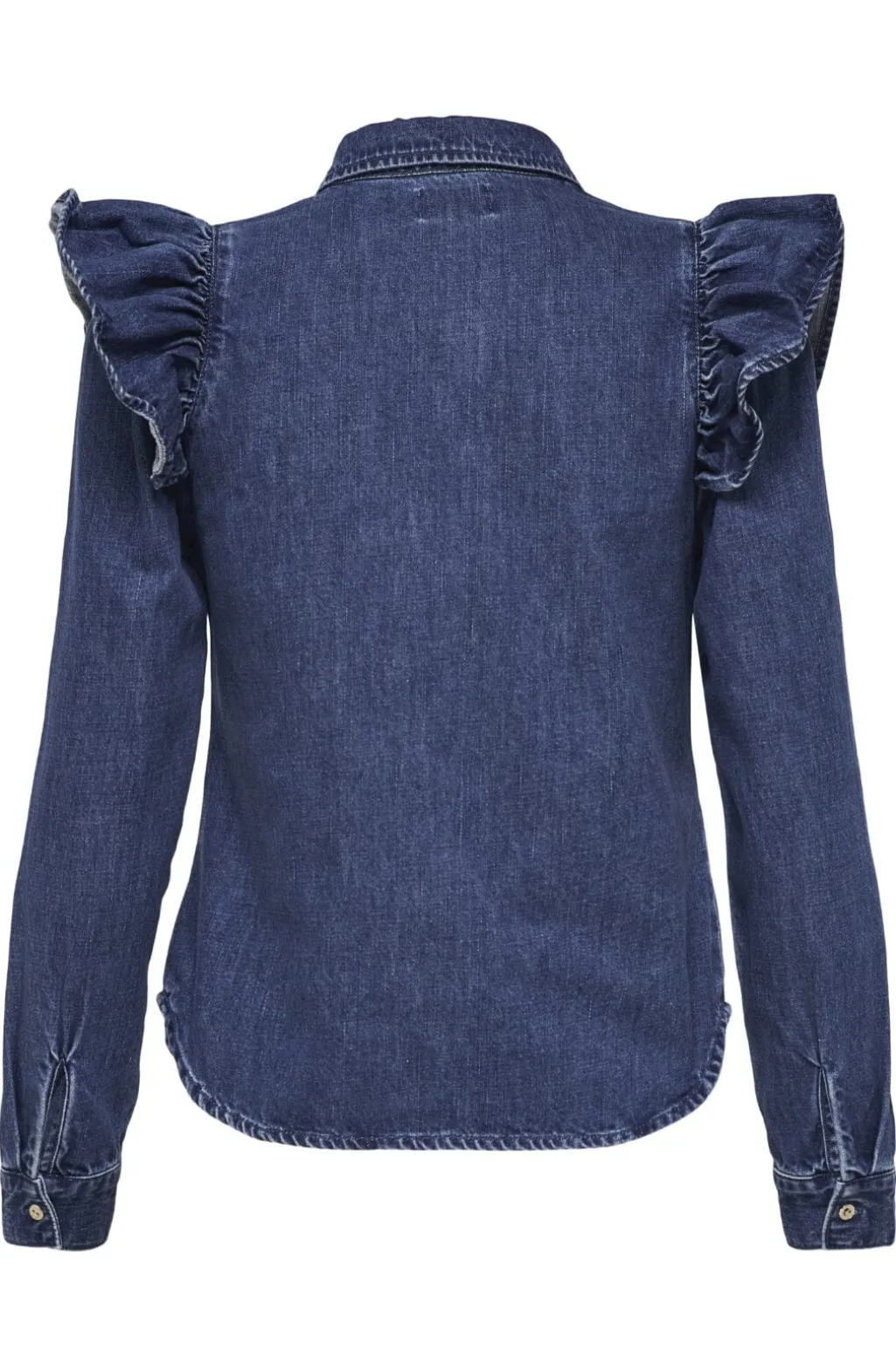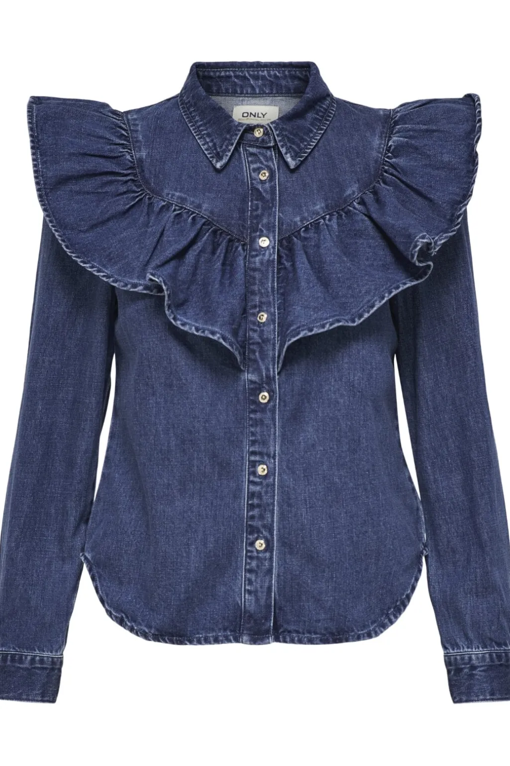 Mørkeblå denimskjorte fra Only med store flæsedetaljer på brystet. Skjorten har en afslappet pasform, skjortekrave og lange ærmer med knapper ved manchetterne.