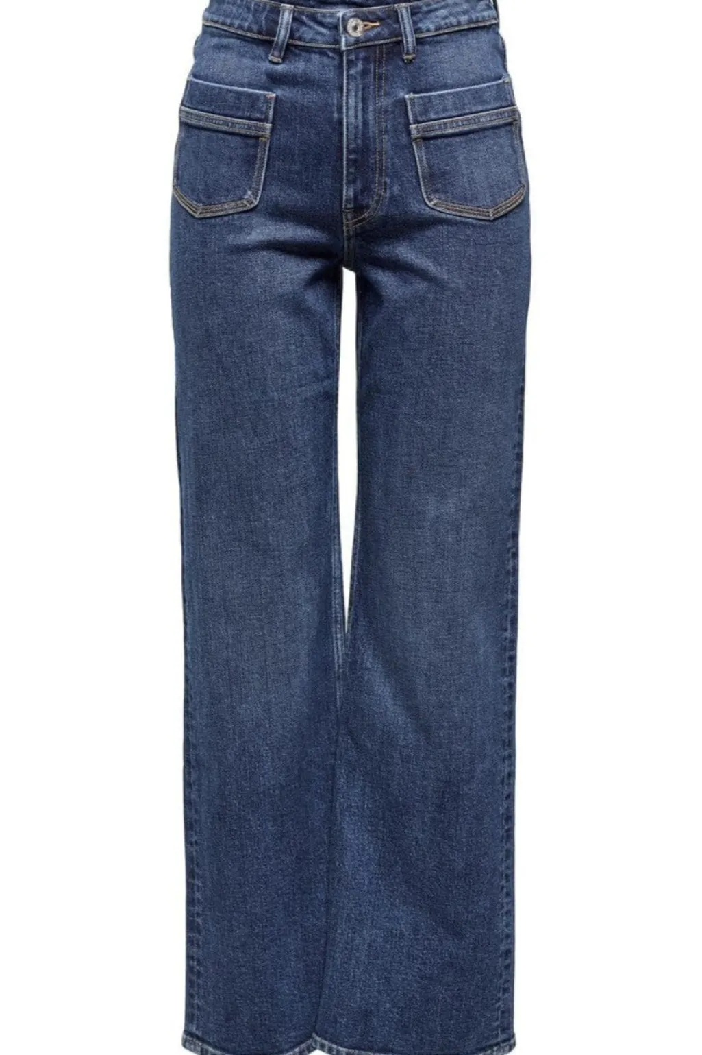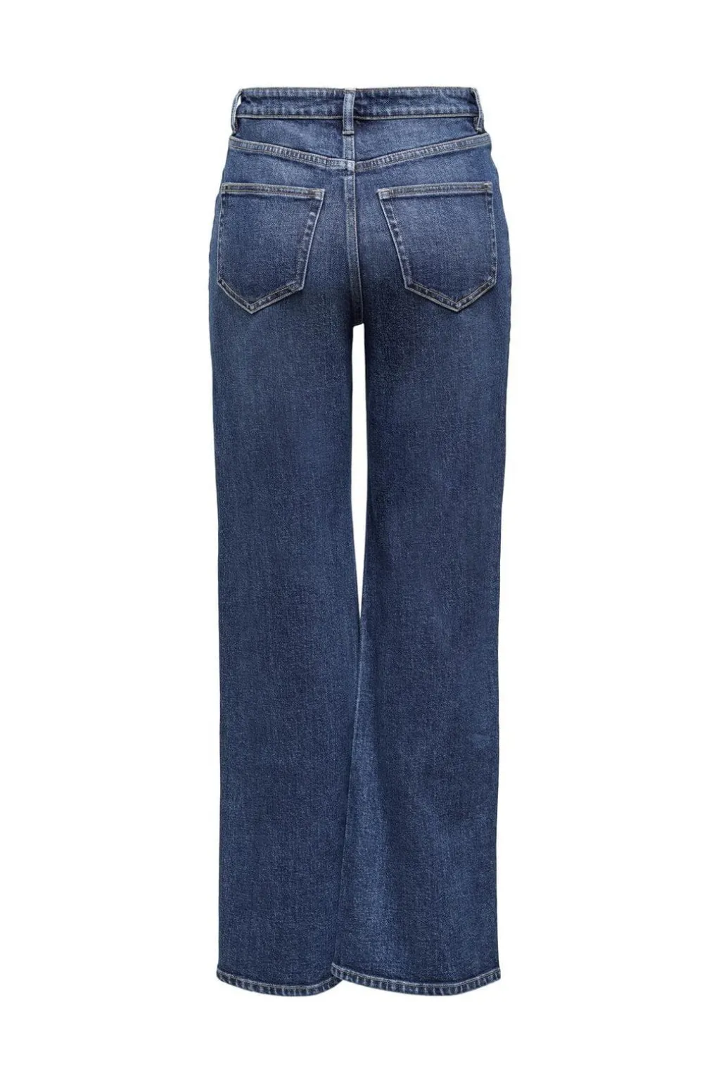 Mørkeblå denimjeans med høj talje og vide ben. De har en løs pasform fra hofte til ankel og praktiske lommer både foran og bagpå.