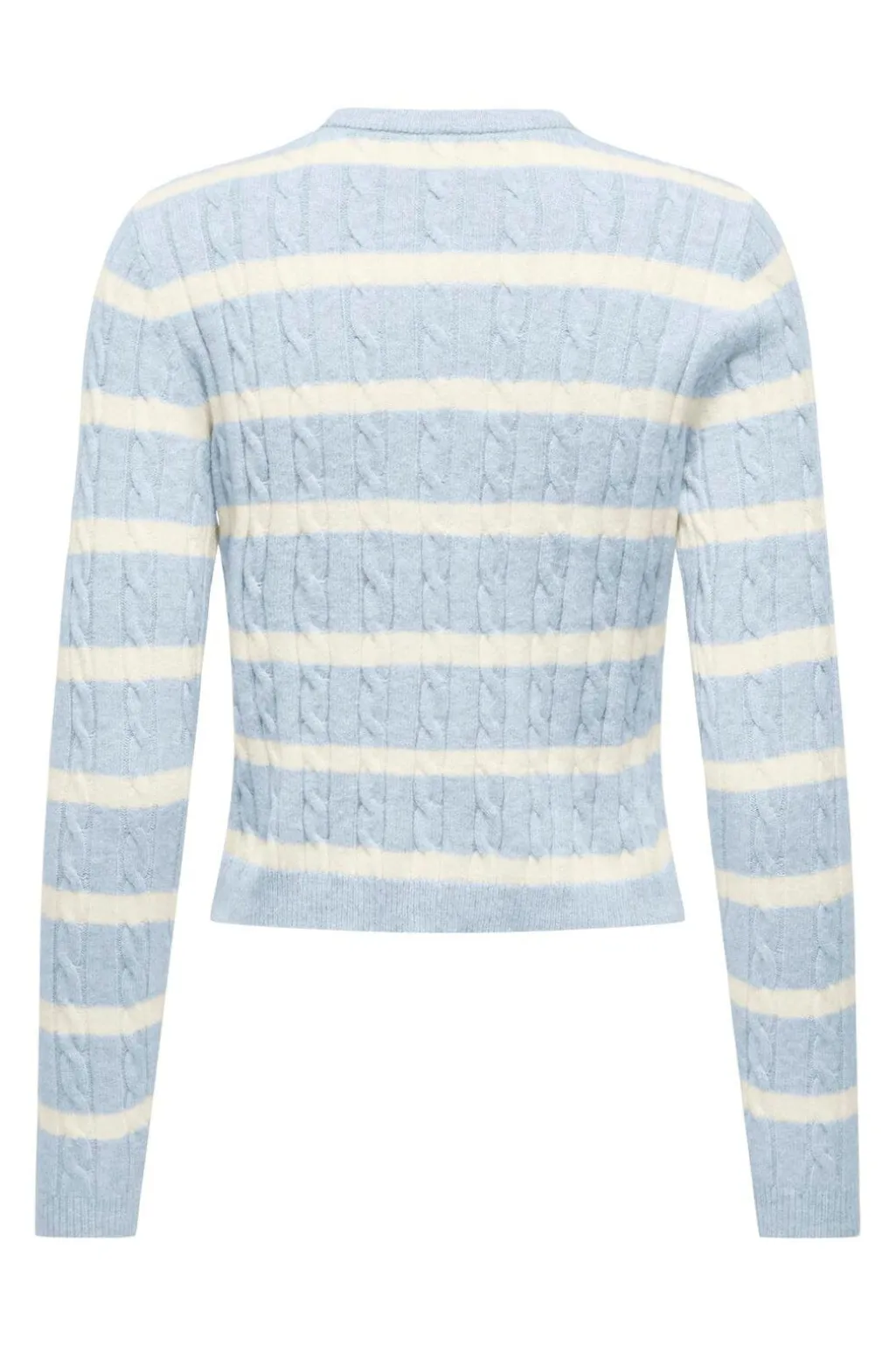 Strikket cardigan fra Only i lyseblå med hvide striber. Cardiganen har kabeldetaljer og knaplukning foran med matchende knapper.