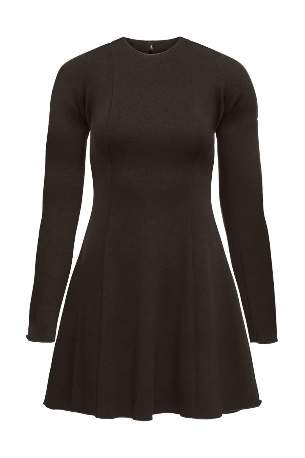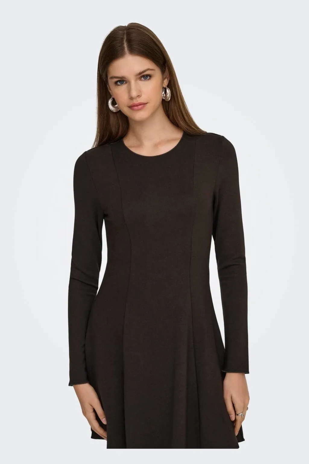 Brun kjole fra Only i knælængde. Den har lange ærmer og en rund halsudskæring. Kjolen er lavet i et blødt materiale med dekorative syninger, der giver den karakter.